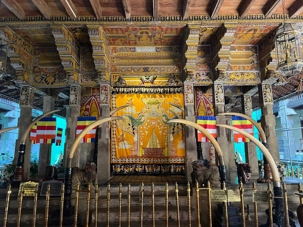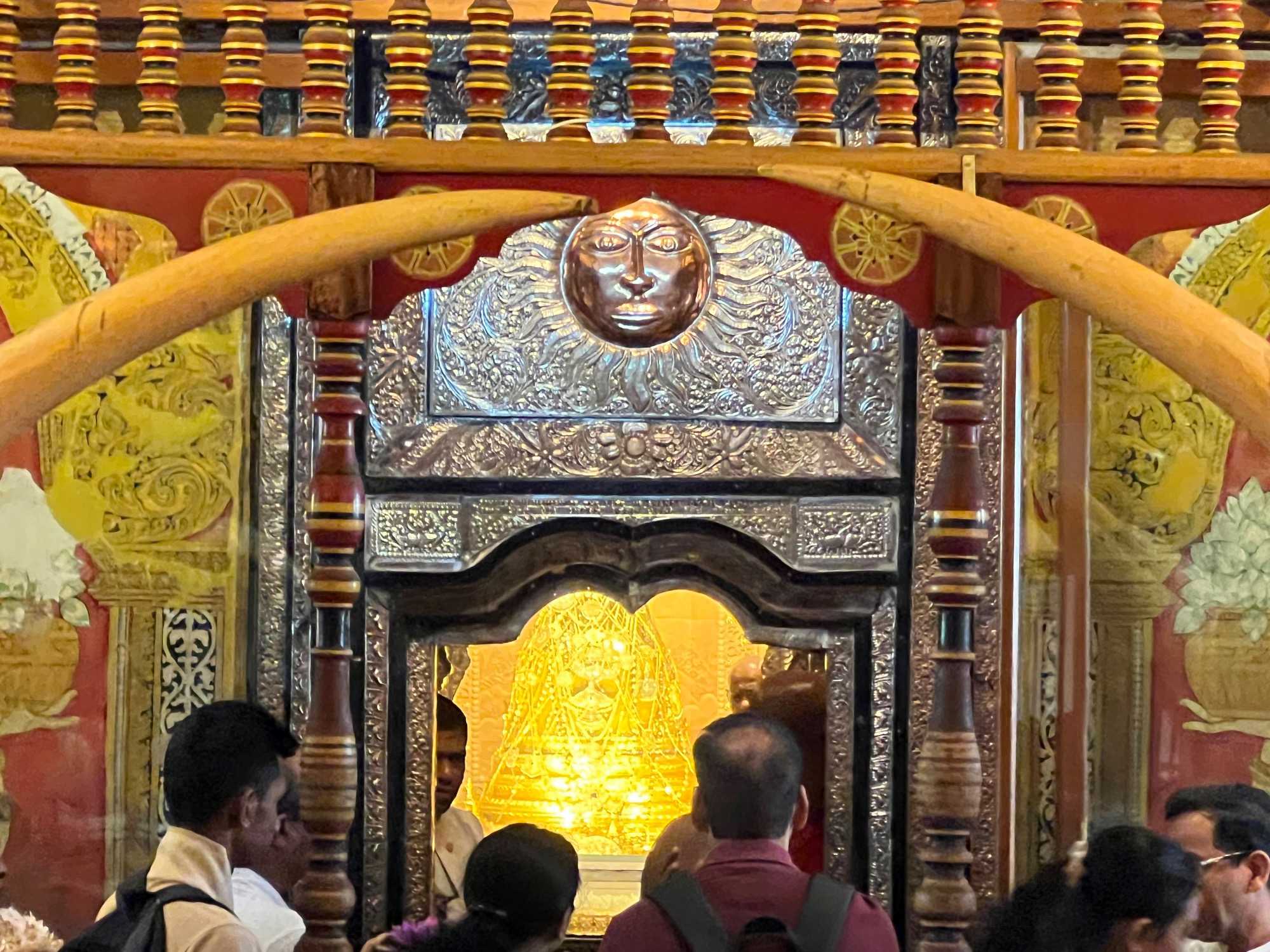 Après un bon petit-déjeuner à l'hôtel, Jaya nous demande d’être prêts tôt ce matin (8h) afin d’assister à la cérémonie du temple de la Dent sacrée. Notre guide fait vraiment un excellent travail pour nous faire voir tout ce qu’il y a à découvrir dans son pays. À notre arrivée au temple, nous voyons arriver deux éléphants sur le site. Quelle ne fut pas notre surprise de voir l’éléphant faire une génuflexion (oui oui, j’ai un vidéo qui le prouve!) devant un endroit sacré. Il était bien dressé cet éléphant!. Le Temple de la Dent sacrée (moi qui pensait que c’était le temple de la Dent sucrée, hihihi!) est un des lieux les plus vénérés du bouddhisme. Ce temple est un véritable sanctuaire, gardien de la relique sacrée entre toutes: la dent du Bouddha, qui garantit la légitimité de tout dirigeant cinghalais. En pénétrant dans ses salles richement décorées, nous constatons la ferveur de ce peuple. Ce temple attire des milliers de pèlerins et de visiteurs chaque année. Ce lieu saint est inscrit sur la Liste du patrimoine mondial de l’UNESCO depuis 1988. Tous les bouddhistes sri-lankais se doivent de s’y rendre au moins une fois dans leur vie en pèlerinage. Le reliquaire doré en forme de stupa abrite la dent sacrée, cachée dans le plus petit des six autres coffrets gigognes. Il y a 3 processions par jour et nous assistons à celle de 9h30. Les moines ouvrent alors la porte où se trouve la relique. On ne voit pas la dent elle-même mais un écrin de dorure. Mais ce qu’il y a du monde! Il y a beaucoup de fidèles en prière. Après quelques autres visites dans et autour du temple, nous nous dirigeons vers notre deuxième visite de la journée.