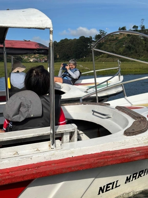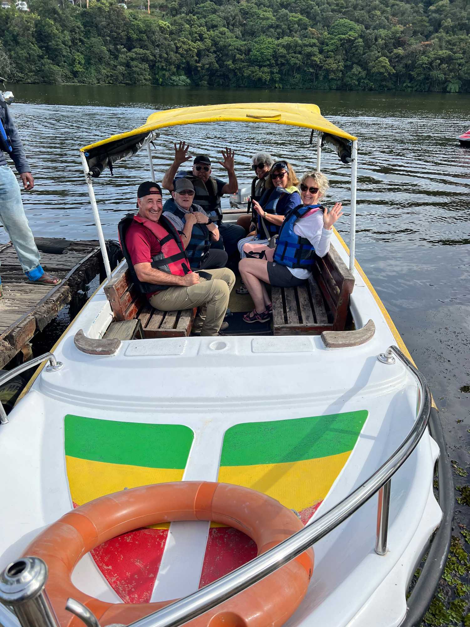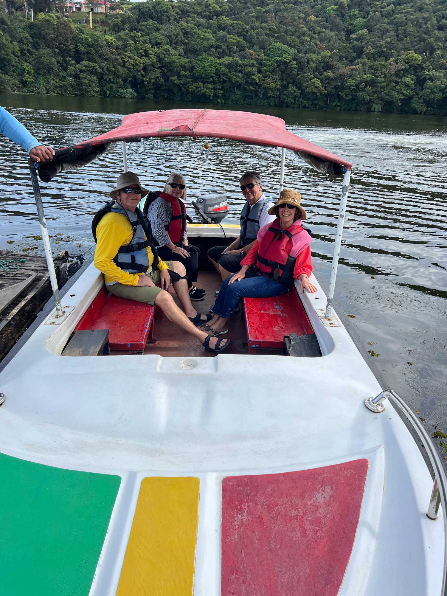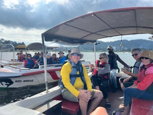 Nous arrivons au lac Gregory, où nous embarquons à bord de petits bateaux à moteur (nos yachts, comme disait Marie-Josée!) pour une balade en bateau. Le lac est calme, malgré quelques bateaux qui s’amusent à faire des courses autour de nous. La ballade est très agréable. C’est la première fois qu’on sent le besoin de mettre une petite laine ou un coupe-vent. Ça fait du bien!