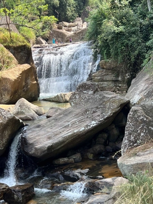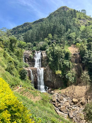 Après le déjeuner, nous sommes prêts à partir vers les montagnes du Sri Lanka. Notre plan a changé un peu: au lieu de nous y rendre en train, nous prenons la route avec notre bus. Le paysage étant le même, cela nous permet de partir plus tard et d’être autonome pour faire des arrêts en chemin. La route serpente à travers les montagnes verdoyantes et les plantations de thé qui semblent s'étirer à l'infini. C'est un véritable spectacle avec les paysages grandioses qui défilent. Nous traversons des villages et découvrons des cascades ainsi que des collines ondulantes qui sont un véritable enchantement visuel.