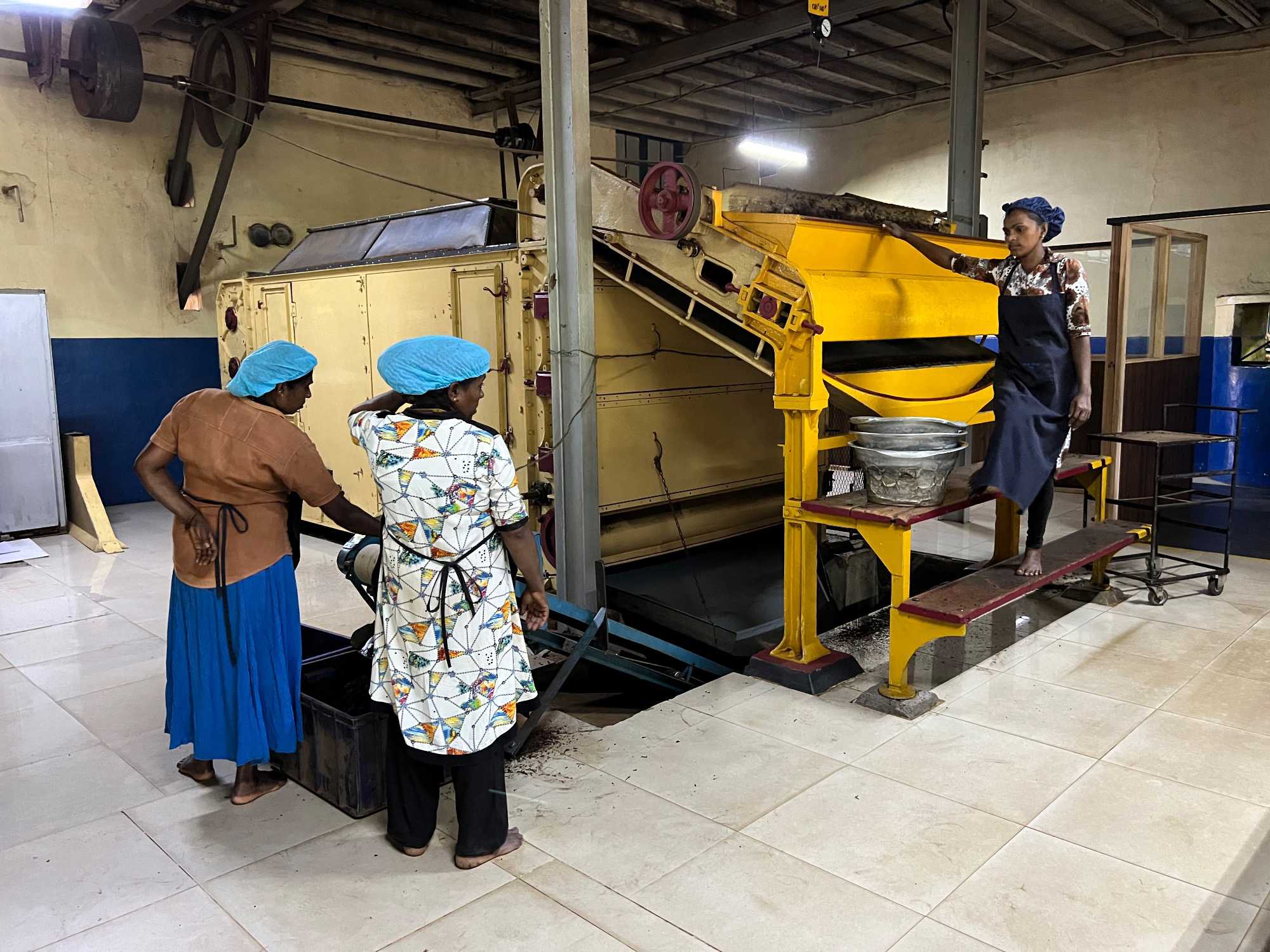Puis, Jaya nous fait faire le tour de l’endroit en nous expliquant toutes les étapes de la production. Nous avons droit ensuite à une dégustation de 10 sortes de thé différentes, allant du plus doux au plus fort. Maintenant, c’est au tour des hommes de participer à une dégustation à l'aveugle. Trois sortes différentes de thé sont proposées et, après avoir pris le temps de s’imprégner des arômes, ils doivent deviner lequel on leur fait goûter. Les yeux bandés, la compétition devient plus intense et plus drôle. Cette fois, c’est Bernard qui a gagné, suivi par les 2 finalistes Denis B et Jean. Félicitations messieurs!