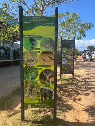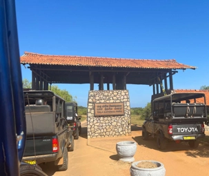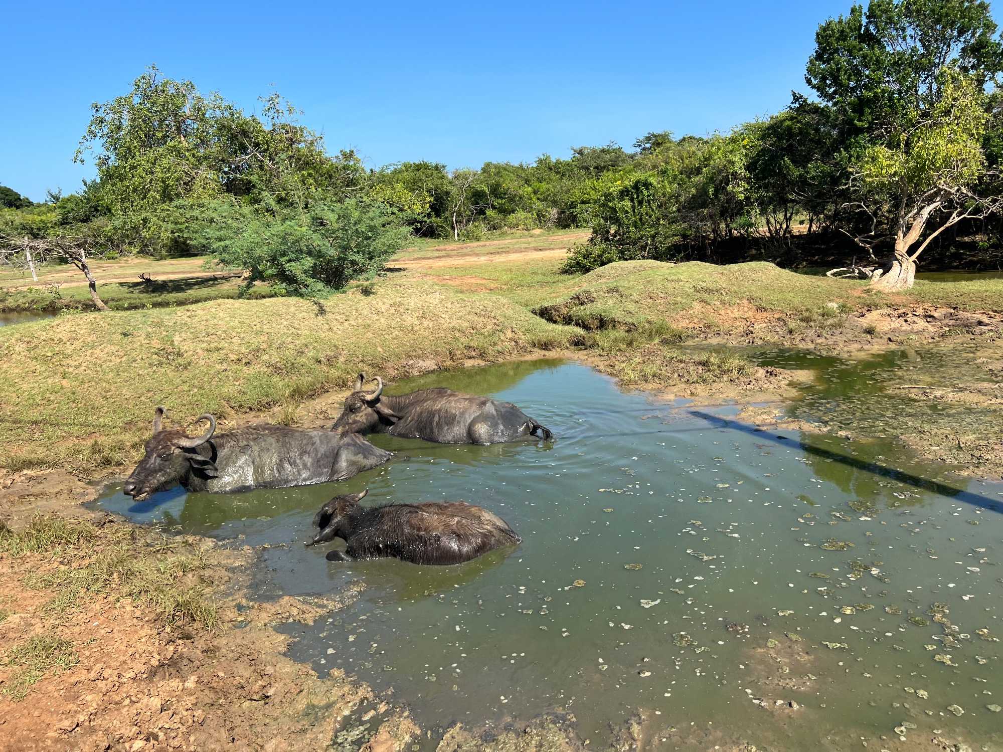 Après un délicieux dîner, nous embarquons dans des 4x4 pour aller à la découverte de l’un des parcs nationaux les plus célèbres et les plus riches du Sri Lanka, le parc Yala. Ce parc, deuxième des parcs nationaux sri-lankais par la taille (978 km2), est le plus fréquenté. La vedette des lieux ? La panthère de Ceylan, appelée aussi léopard du Sri Lanka. Yala abriterait en effet la plus forte concentration de ces discrets félins, une espèce endémique et menacée. C’est bien installé dans notre voiture que notre safari commence. Cette fois, nous n’avons pas à attendre longtemps: la faune environnante se montre à nous. Dans notre 4x4, Marie-Josée a la chance d’apercevoir un léopard. Wow, nous restons aux aguets pour nous aussi l’apercevoir. Mais sans succès… Il y a beaucoup de diversité dans ce parc. Nous voyons plusieurs buffles, des paons, des singes, des crocodiles, toutes sortes d’oiseaux, un caméléon, des mangoustes, des varans, un hibou, des coqs de bruyère, des calaos, des cigognes colorées, des biches, des cerfs. Nous avons beaucoup de plaisir à chercher les animaux. Les paysages alternent entre forêts denses et savanes ouvertes.