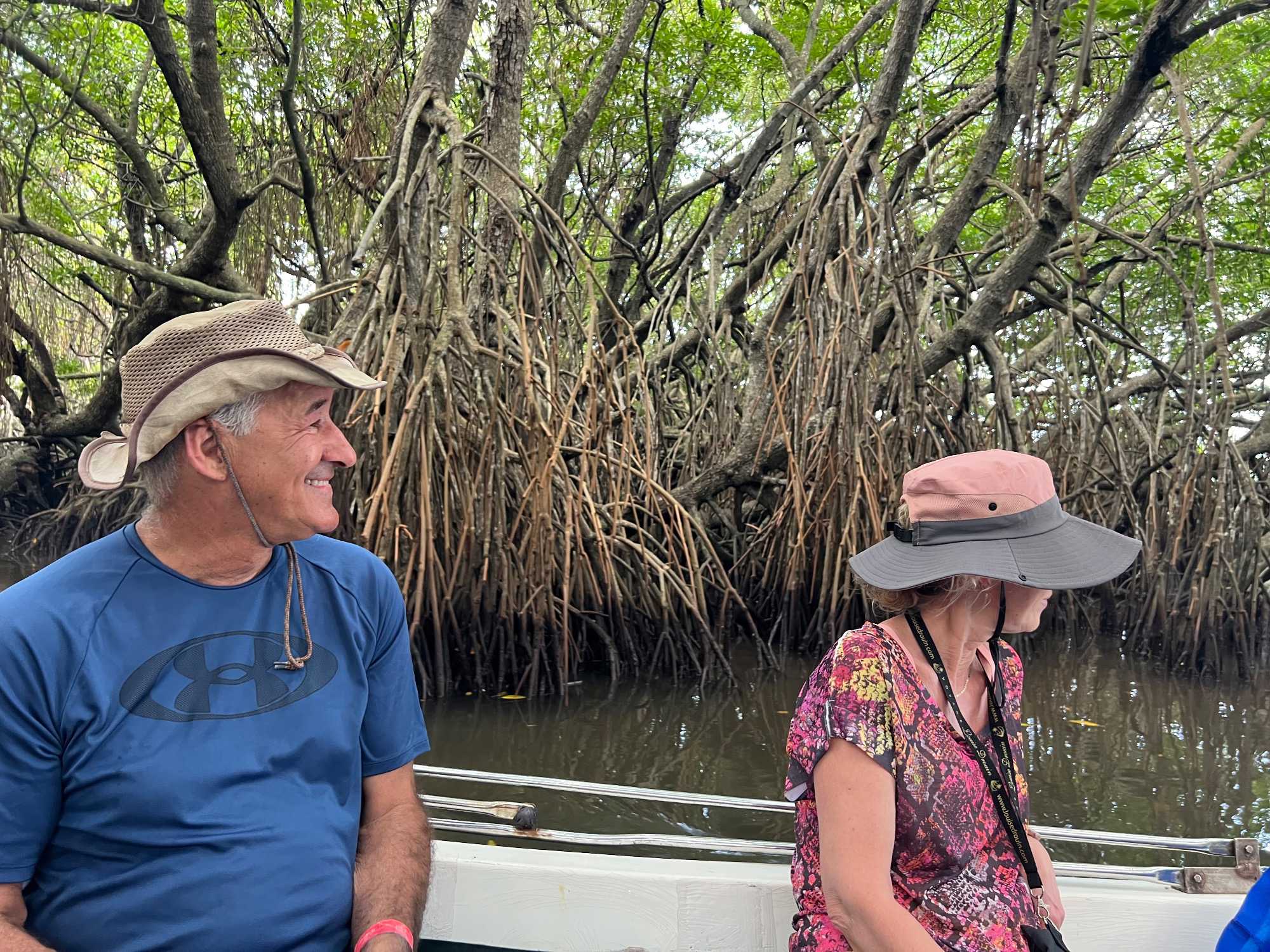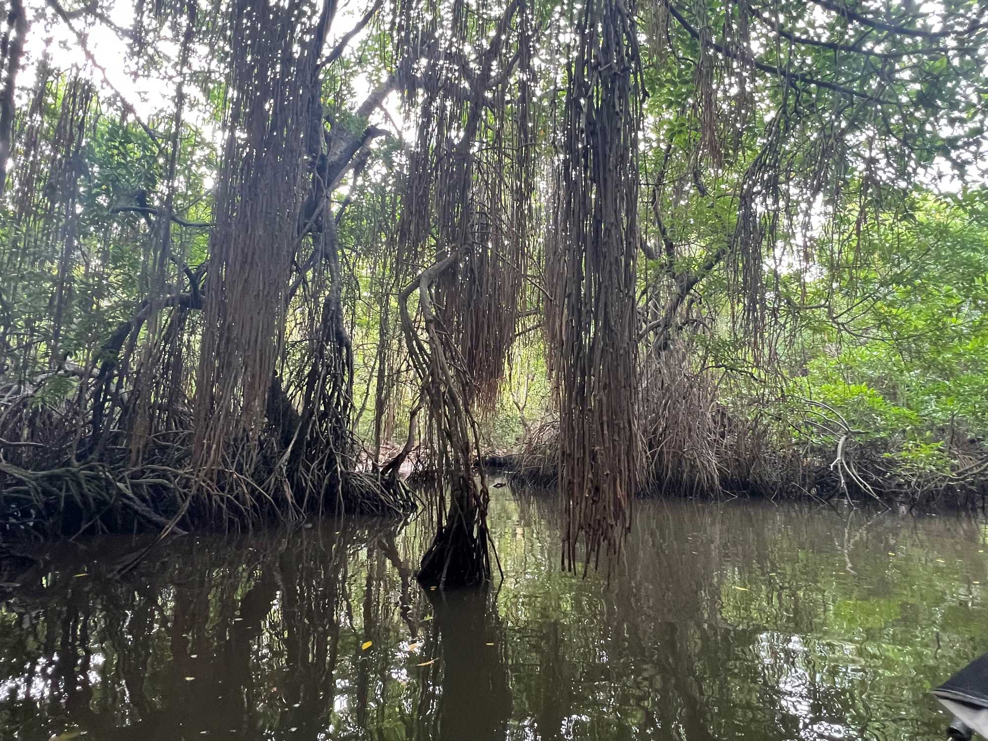 Ce sera la grasse matinée pour plusieurs, mais pas pour tous! Ce matin, Marie-France, Jean, Jacques et moi partons en excursions dans les mangroves. Un petit tour en tuk tuk de 10-15 minutes et nous voilà rendus au bateau. Comme ça fait 3 excursions que je fais avec cette compagnie, je les connais bien. Nous avons un excellent service avec eux. On embarque dans le petit bateau avec Mano, le même guide que pour les autres journées. On longe le bord de la rivière tranquillement en cherchant les animaux que nous pourrions voir. Il y a plusieurs chauve-souris qui sont faciles à voir, certaines dorment mais pas toutes (j’en ai pris une en vol dans les photos). On voit deux varans d’eau et une très belle méduse colorée. Beaucoup d’oiseaux aussi. Puis on entre dans les mangroves. Le décor est tellement différent, on dirait qu’on entre dans un nouveau monde. C’est une belle promenade que nous faisons sous les arbres. Puis retour au quai où on dit au revoir à nos charmants hôtes, que je reverrai sûrement l’an prochain.