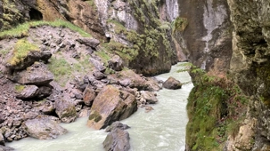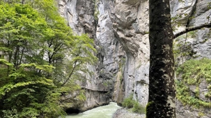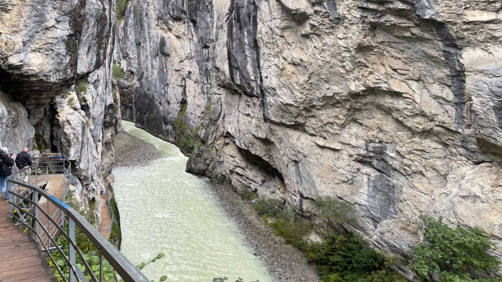 Nous sommes loin d'être les premiers à emprunter cette route puisqu'elle existe depuis près de 100 ans. C’est une merveille de la nature de 1400 m de long et de 200 m de profondeur. Les gorges ont été sculptées par la force de l’eau contre les rochers. Nous pouvons l’admirer en empruntant un chemin piétonnier qui nous fait longer les gorges en empruntant tunnels et passerelles, presqu’à fleur d’eau (quelques mètres), qui nous ébahissent. Nous avions l’impression de faire partie de la montagne. Que d’émerveillement devant cette nature différente! Ces gorges sont vraiment spectaculaires! Elles se trouvent dans la vallée du Hasli entre Meiringen et Innertkirchen. Vous comprendrez que j’ai de la difficulté à l’écrire, imaginez à le prononcer! Ce sera comme cela un peu tout le long du voyage, n’oublions pas que nous sommes en Suisse-Allemande.