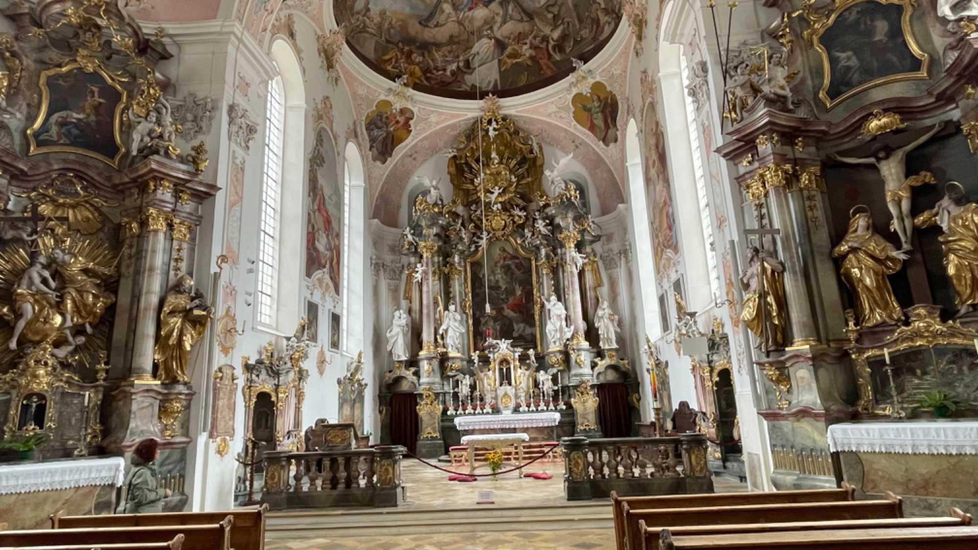 Direction Oberammergau, en Haute-Bavière. Toute une visite guidée, par Mariane. C’est une commune très célèbre pour son « Jeu de la Passion », pièce de théâtre jouée tous les 10 ans depuis l’an 1634. La dernière représentation eut lieu en 2022. Évidemment on a dû cesser durant les périodes de guerre et à quelques autres occasions. Plus de 2 000 habitants de la ville y participent : acteurs, chanteurs, instrumentistes et techniciens de scène participent au « jeu de la Passion » six heures durant. De plus, la ville est ornée de superbes fresques à motifs religieux et de sculptures religieuses de la bourgade. Génial, il faut voir ça! C’est dans ce décor enchanteur que nous avons pris notre déjeuner (dîner). C’est probablement ici, entre autre, que s’est inspirée la petite ville de Chimanus, sur l’île de Vancouver, pour revitaliser son centre-ville en peignant des fresques relatant son histoire.