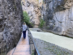 Nous sommes loin d'être les premiers à emprunter cette route puisqu'elle existe depuis près de 100 ans. C’est une merveille de la nature de 4600 pieds de long et de 657 pieds de profondeur. Les gorges ont été sculptées par la force de l’eau contre les rochers. Nous pouvons l’admirer en empruntant un chemin piétonnier qui nous fait longer les gorges en empruntant tunnels et passerelles, presqu’à fleur d’eau (quelques pieds), qui nous ébahissent. Nous avions l’impression de faire partie de la montagne. Ce que l’on a admiré a pris 1 million d’années à se former. Nous y avons marché plus ou moins 1.5 kilomètres et nous sommes délectés de sa splendeur. Que d’émerveillement devant cette nature différente! Ce sera comme cela un peu tout le long du voyage, n’oublions pas que nous sommes en Suisse-Allemande. Ces gorges sont vraiment spectaculaires! Elles se trouvent dans la vallée du Hasli entre Meiringen et Innertkirchen. Vous comprendrez que j’ai de la difficulté à l’écrire, imaginez à le prononcer!