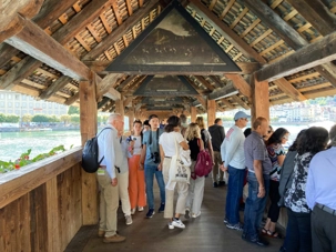 Si tous les chemins mènent à Rome, eh bien toutes les voies ferrées mènent à Lucerne. C’est pour vous dire qu’il y en a beaucoup. C’est normal, cette ville date entre 1180 et 1200 ans! Elle est habitée depuis les temps préhistoriques et possède des attractions touristiques célèbres dans le monde entier entre autres, le pont couvert en bois. Le Kapellbrücke, que nous empruntons, est le plus vieux d'Europe. Il est devenu indissociable de la cité de même que sa tour d’eau octogonale. En fait, c'est une ancienne prison. La ville a su préserver son histoire par ses habitations, de belles constructions qui datent des années 1600, une vraie beauté.