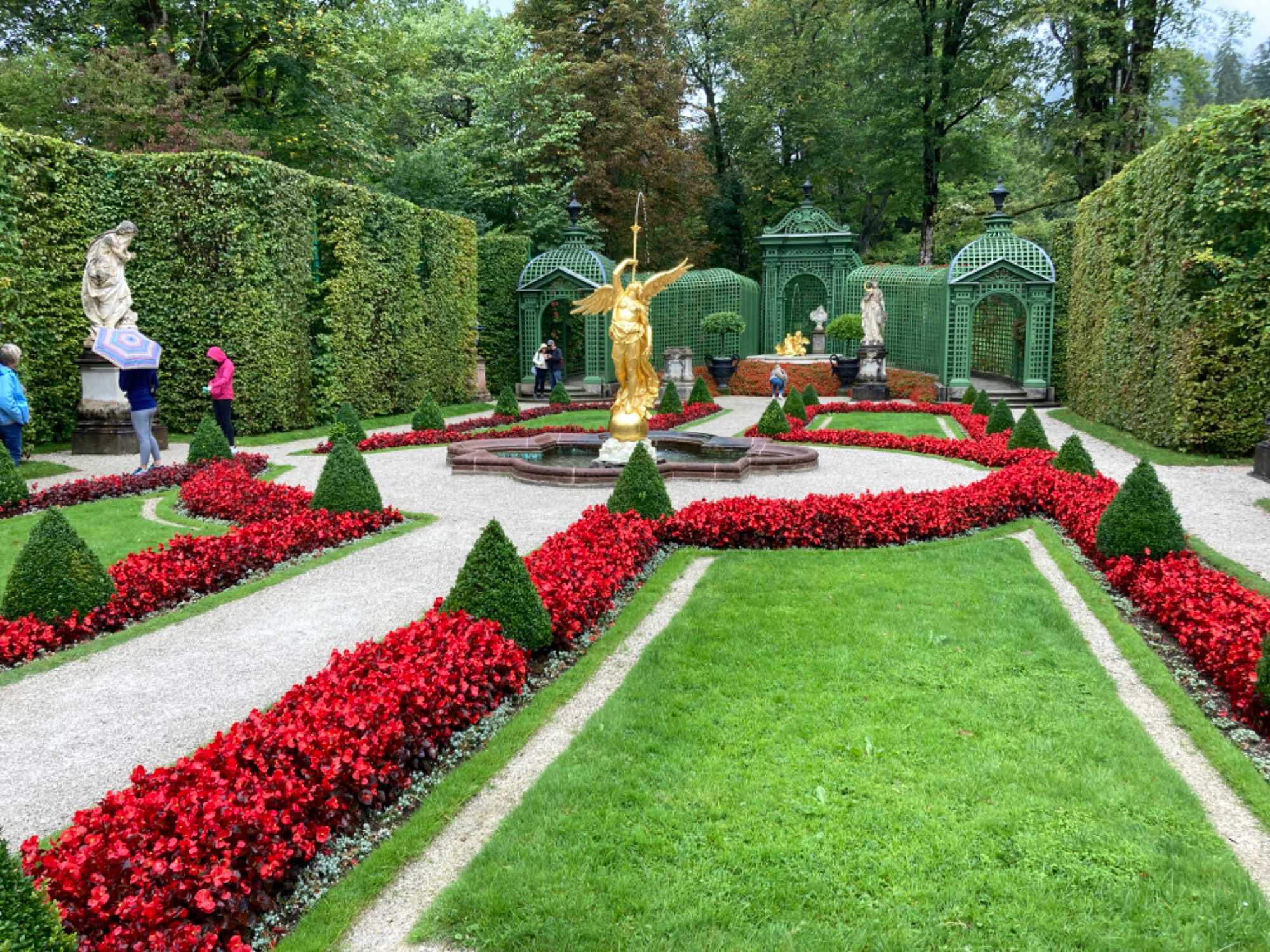 En route vers le château de Linderhof, reproduction miniature du Trianon de Versailles, que nous avons visité. Ce château fut construit sous Louis II de Bavière, tout un domaine! Il fut le seul à être terminé de son vivant, c’était son endroit préféré. Il est visité par des milliers de touristes. Après cette visite, nous avons une bonne idée de ce que pouvait avoir l’air les châteaux de l’époque, puisque c’en un!
