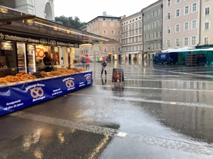 Bon, voici la vérité concernant ce qui s’est passé ce soir : lorsque nous avons quitté l’hôtel avec l’autobus, pour se rendre à notre souper de Mozart situé dans le vieux Salzbourg, la température était nuageuse et je remarque que mes voyageurs embarquent dans l’autobus sans imperméable, ni parapluie. Je me suis dit : « La météo n’annonce pas de pluie, il n’a pas plu de l’après-midi et que quelques gouttes ce matin, il ne devrait pas pleuvoir ce soir! » Les prévisions étaient erronées!