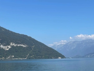 Après l’avion et l’autobus, on prend un bateau. Eh oui, on aura -presque- tout fait. Une balade d’environ une heure nous fait découvrir un autre côté de la Suisse : des montagnes, des alpages, des maisons en montagne et sur le bord de l’eau, de plusieurs styles d’architecture et l’eau d’un bleu turquoise semblable à la couleur du ciel. Nos voyageurs apprennent à se connaître, ils ont du plaisir.