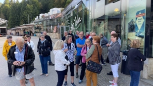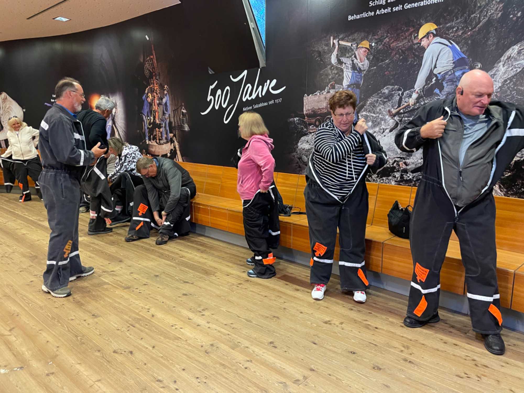 Nous visitons la mine de sel de Salzbergwek de Berchtesgaden. En arrivant, nous sommes attendus par le guide de la mine qui nous amène dans une salle où on enfile des habits de mineurs. Ça l’air simple mais c’est compliqué dans le sens que vous vous imaginez 35 personnes mettre une salopette?! Pas tous dans la même salopette mais chacun une!! Enfin nous sommes tous prêts et partons en train, si on peut appeler ça comme tel. Assis un en avant de l’autre et nous voilà partis. Il ne faut pas être claustrophobe car certains endroits sont assez restreints. Inutile de vous dire que ça descend...dans les profondeurs de la terre. Après un certain temps on débarque de ce petit train et c’est là que la fête commence. Soit on descend l’escalier ou, en équipe de quatre, on descend abruptement comme une grande rampe que l’on nomme le toboggan qui nous mène, en 10 secondes, encore plus profondément dans la terre. C’est beaucoup plus rapide que l’escalier, croyez-moi! Imaginez les cris lors de la descente, nous nous sommes vraiment amusés, comme des enfants, incroyable. Attendez, ce n’est pas fini! Nous nous rendons à un lac sous-terrain, dans lequel est extrait le sel, et nous voici assis dans un radeau, un genre de ponton, afin de traverser le lac et nous rendre vers l’autre rive où la visite guidée se poursuit. La traversée, d’une longueur d’approximativement 1000 pieds, se fait dans la noirceur. C’est magnifique, vraiment différent, toute une expérience. Nous y avons appris beaucoup de choses dans cette visite de 90 minutes.