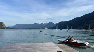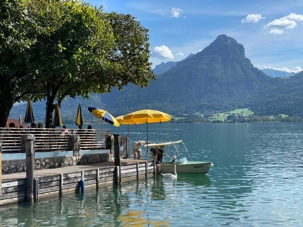 Cette marche nous donne faim. Nous nous rendons à St-Wolfgang pour dîner dans un restaurant haut de gamme qu’on appelle le Cheval Blanc, nous avons une salle réservée pour nous avec vue sur le lac, on est privilégié. Au menu : un demi-poulet, c’est beaucoup. Par la suite, une petite visite de l’église de la ville. Un arrêt pour admirer le retable de Michael Pacher, chef-d’œuvre de l’art gothique, puis croisière sur le Wolfgangsee jusqu’à Saint-Gilgen. Une vue magnifique sur la rive du lac.