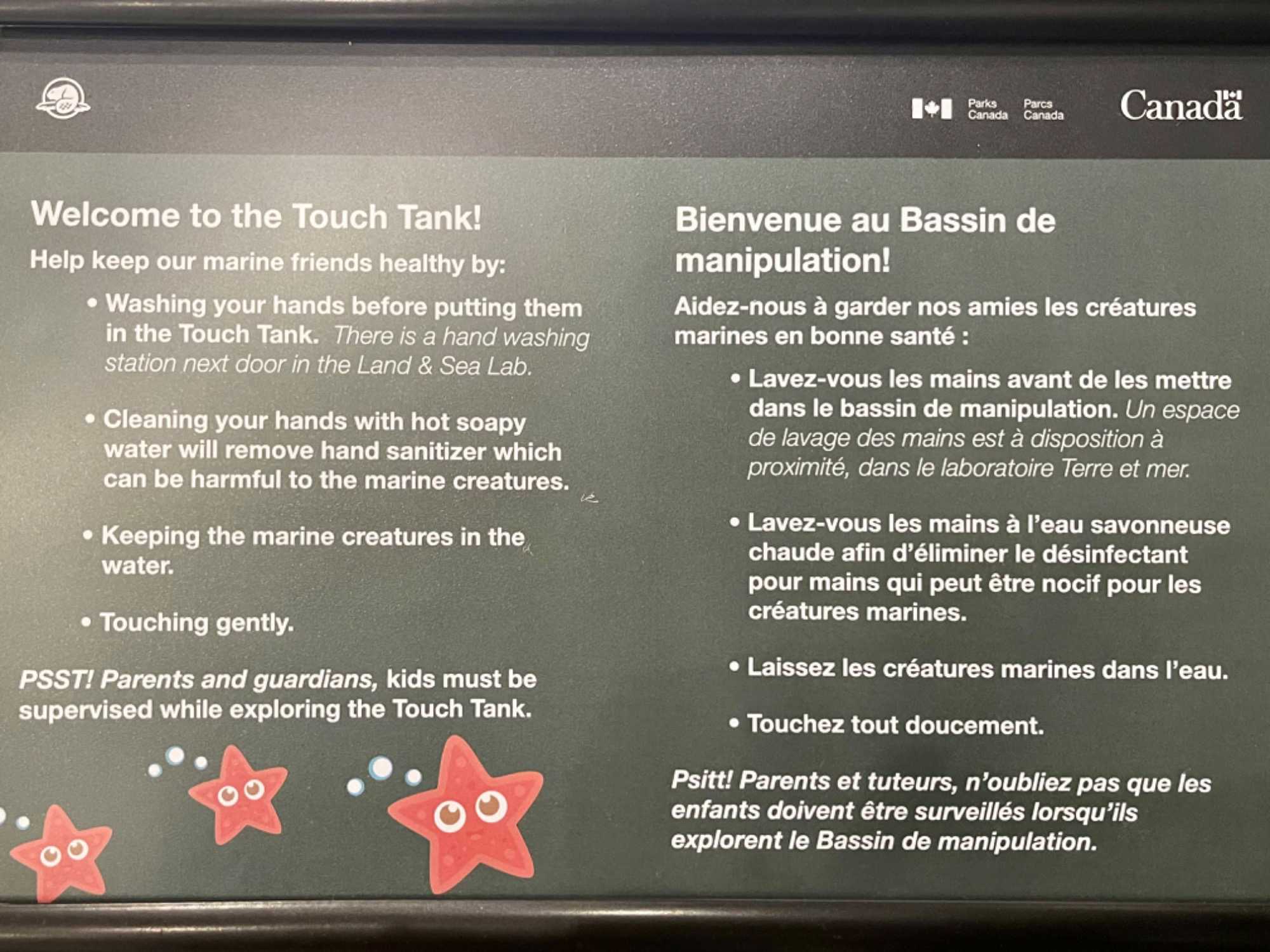 Nous prenons un excellent petit-déjeuner puis nous traversons le parc national Terra Nova. Situé à la jonction des régions Centre et Est, ce parc célèbre la beauté unique de la forêt boréale qui s’entremêle subtilement avec l’océan Atlantique, créant des bras de mer protégés, des fjords majestueux, des îles et des étangs. S’il y a aujourd’hui trois parcs nationaux (et un 4ème en devenir) à Terre-Neuve-et-Labrador, la création du parc national Terra Nova fut à cette époque un véritable pionnier pour la toute jeune province canadienne, en étant le premier à être officiellement créé, en 1957. Notre dynamique et efficace guide Lucie, avait fait la demande à des personnes de Parc Canada, qui travaillent au centre d’interprétation de nous accueillir avant leur ouverture. Ce fût grandement apprécié car ce centre était des plus intéressant. Nous avons eu nos explications en français sur les bassins contenant de belles espèces des fonds marins du parc Terra Nova. Nous avons appris beaucoup sur la diversité des produits de la mer. Parc Canada a fait un super travail de préservation et des très beaux centres pour notre grand bonheur d’apprendre sur notre pays.