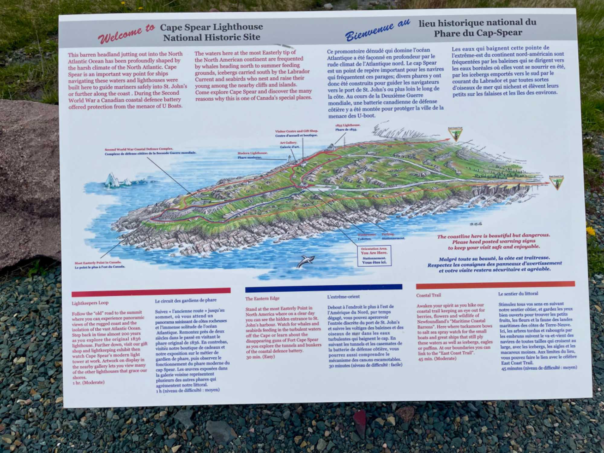 Le panorama est à couper le souffle! Nous reprenons la route pour poursuivre notre belle excursion. Nous faisons une halte au parc national de Signal Hill où le premier signal télégraphique outre-mer a été reçu en 1901. Attrait le plus populaire de St-John, Signal Hill rappelle le passé historique de la ville, et le rôle marquant qu’elle a joué dans l’histoire des communications. Elle offre également des sentiers de randonnée côtiers, des paysages hauts en couleur ainsi qu’une vue panoramique sur l’Atlantique. Signal Hill a été au cœur de la défense du port de St-John du XVIIe siècle jusqu’à la Seconde Guerre mondiale. On peut voir d'où proviennent certaines des pierres qui ont été utilisées pour construire la basilique. De plus quelle vue magnifique qu'offre ce monument des communications et de l'histoire militaire.
