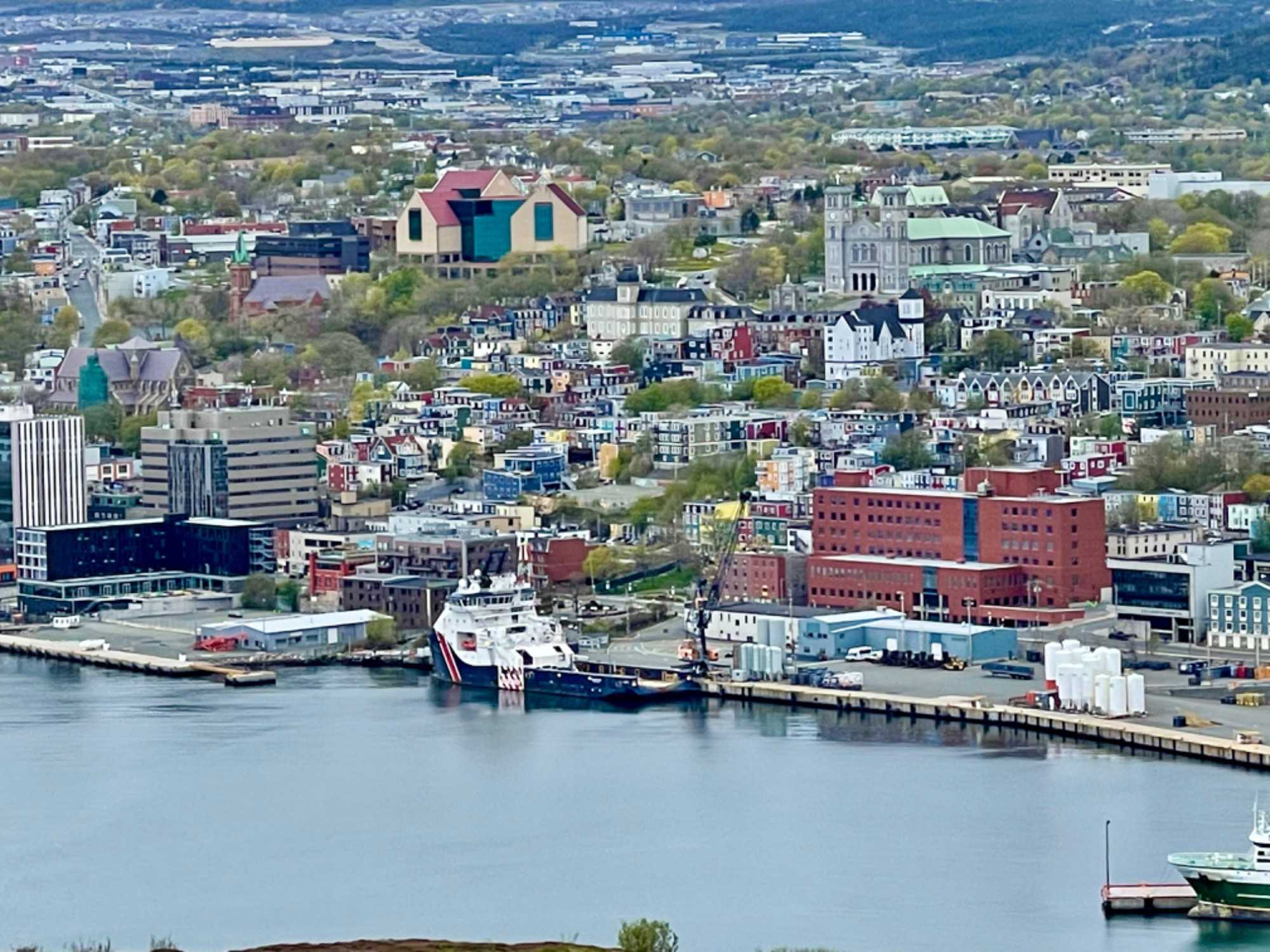 Cet après-midi, nous faisons connaissance avec notre charmante guide locale francophone très sympathique, qui veut nous faire passer un bon moment. Nous partons donc faire un tour de ville pour voir de nombreux sites fascinants de St-John. Notre visite débute par la découverte de Water Street, au centre-ville de St-John. Dans cette artère, qui serait l'une des plus anciennes d'Amérique du Nord, nous trouvons le Centre d'information touristique et de nombreux endroits où manger et magasiner. À l'extrémité sud de la rue se trouve le Railway Coastal Museum, dont les expositions racontent l'histoire des services de chemins de fer et d'expédition de Terre-Neuve, vieux de plus d'un siècle. Puis nous empruntons la Duckworth Street pour nous rendre à The Rooms, un lieu culturel important qui abrite un musée, une galerie et des archives. Nous y reviendrons lundi prochain pour le visiter.