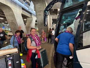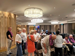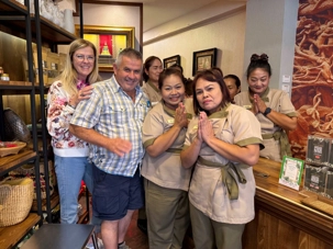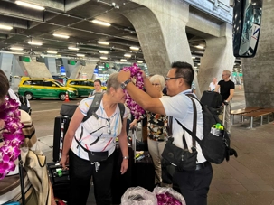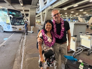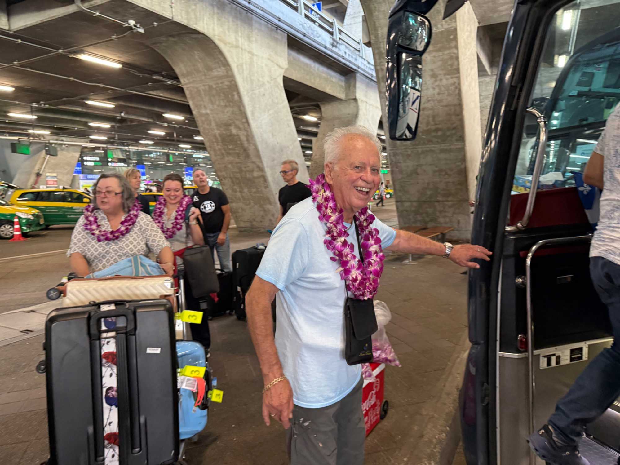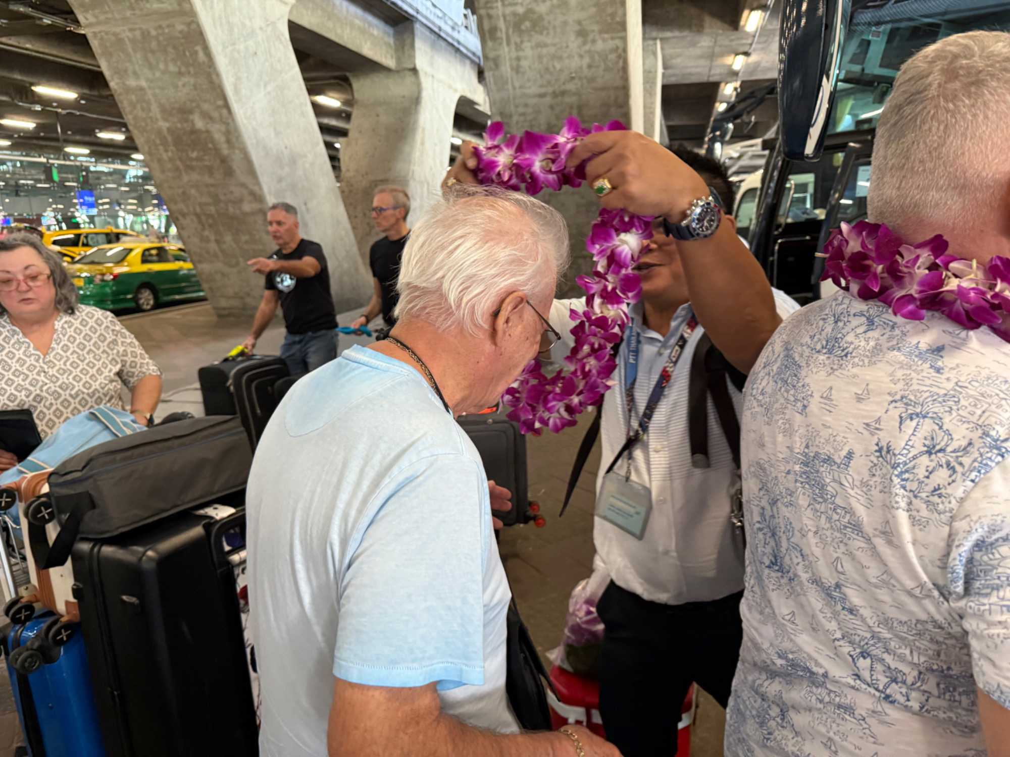 Valises bien en mains, nous nous dirigeons vers la sortie pour prendre l’autocar luxueux qui nous conduira à notre hôtel. Mais avant, Supot, mon frère et notre guide local nous y attend et pour nous souhaiter la bienvenue, il offre à tous les voyageurs des guirlandes de fleurs d’orchidéesqu’on surnomme «mālạy kl̂wymị̂» en thaï. C’est une tradition en Thaïlande que celle d’offrir aux visiteurs cette guirlande en signe de bienvenue. Elles sont fabriquées de fleurs parfumées et parfois complétées de d’autres matières végétales selon l’occasion pour laquelle elles sont offertes. Le charme thaïlandais s’opère déjà chez mes voyageurs qui en sont très reconnaissants.