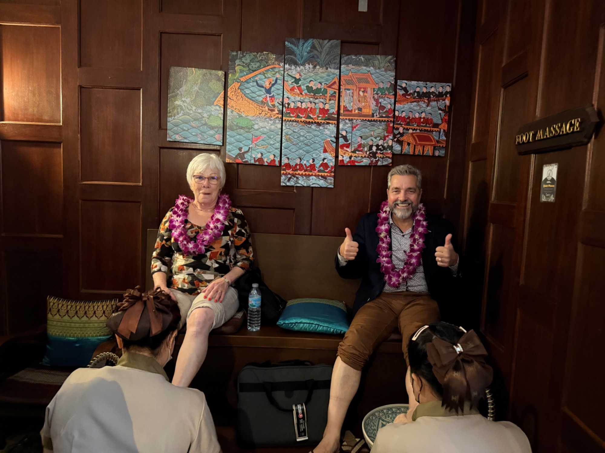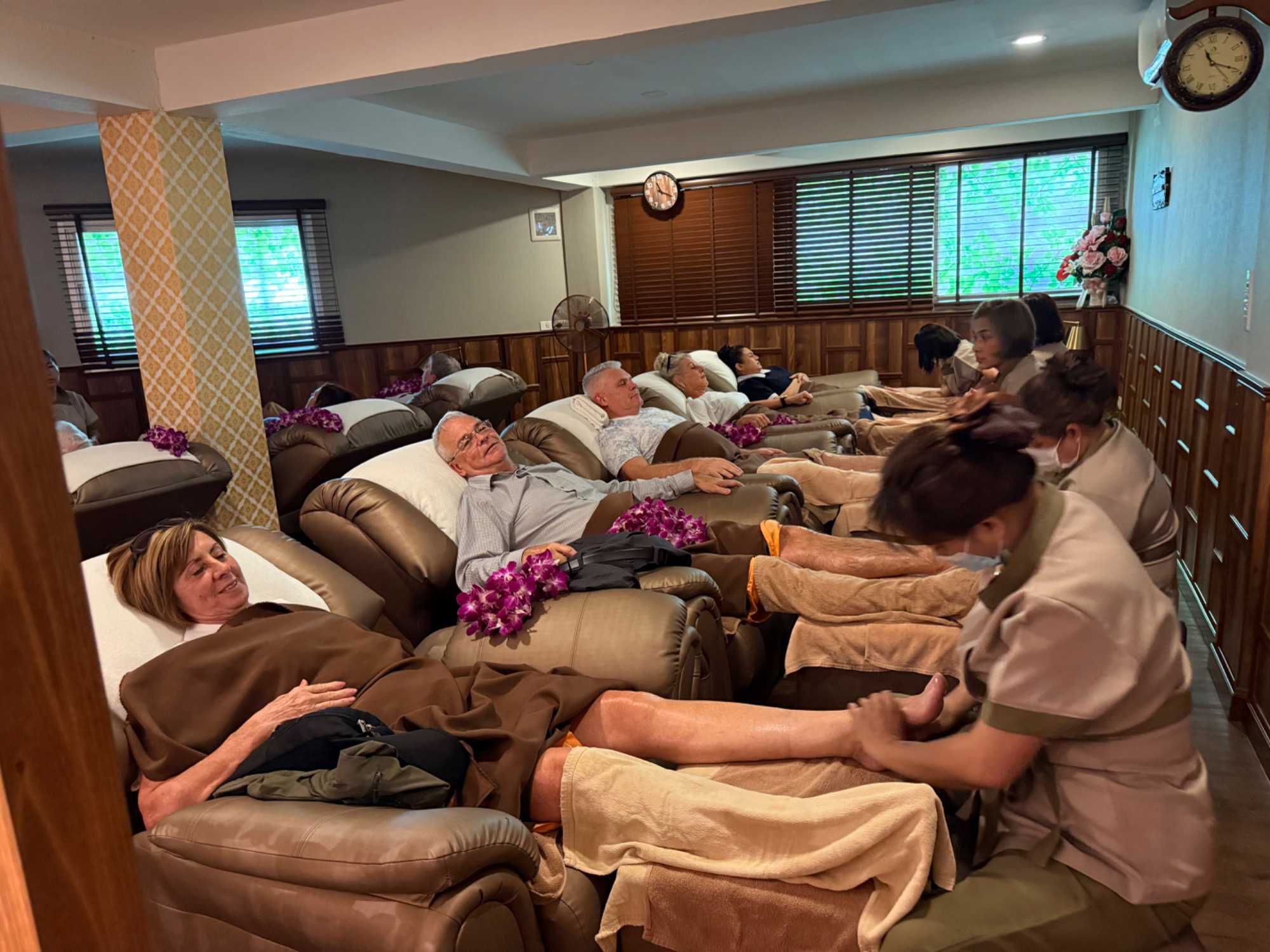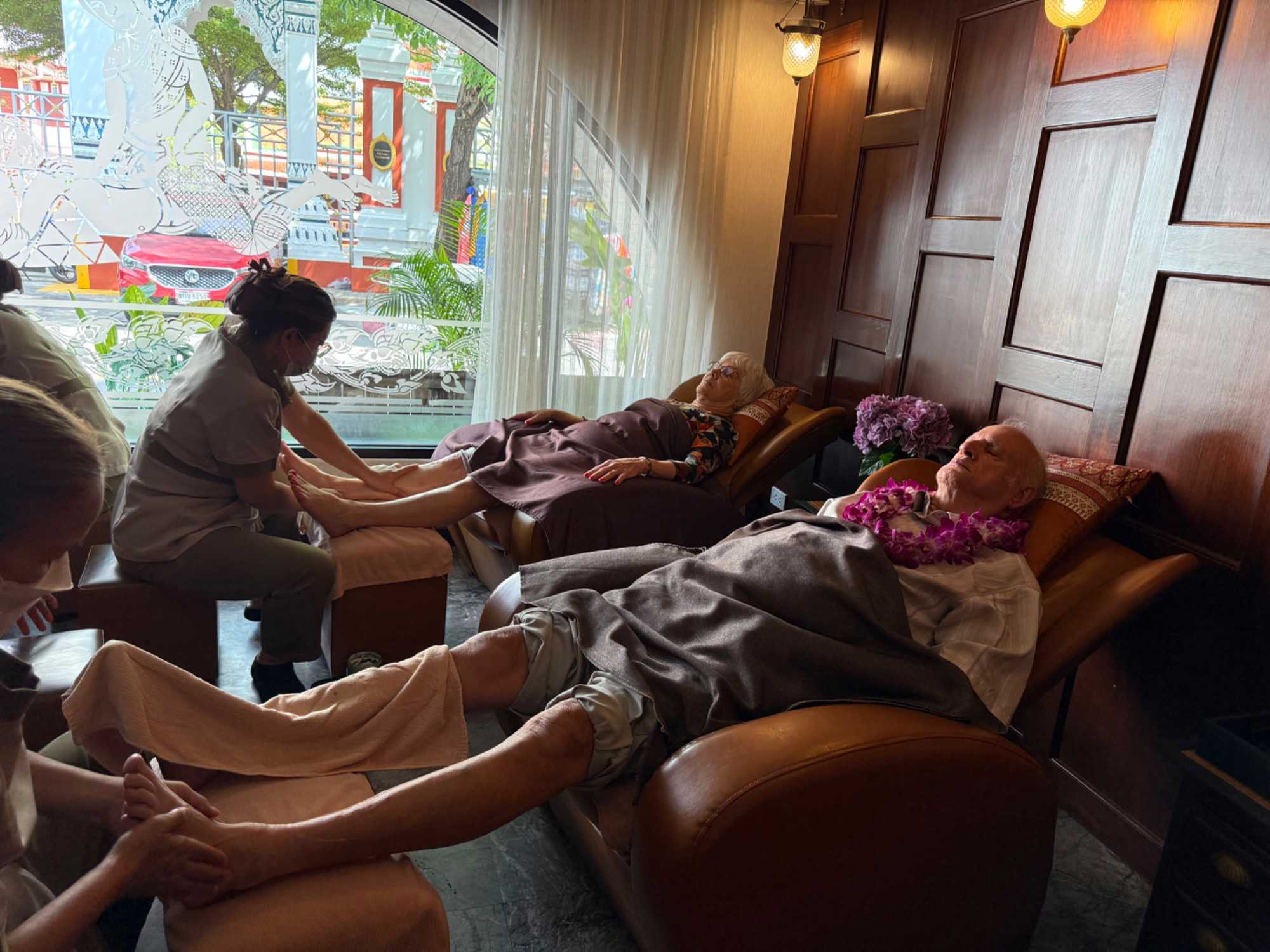 En attendant de pouvoir accéder à nos chambres, une belle surprise attendait mes voyageurs …un massage aux pieds, soit le remède idéal pour reposer les pieds endoloris après un long vol et également une pratique très répandue en Thaïlande.