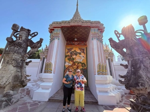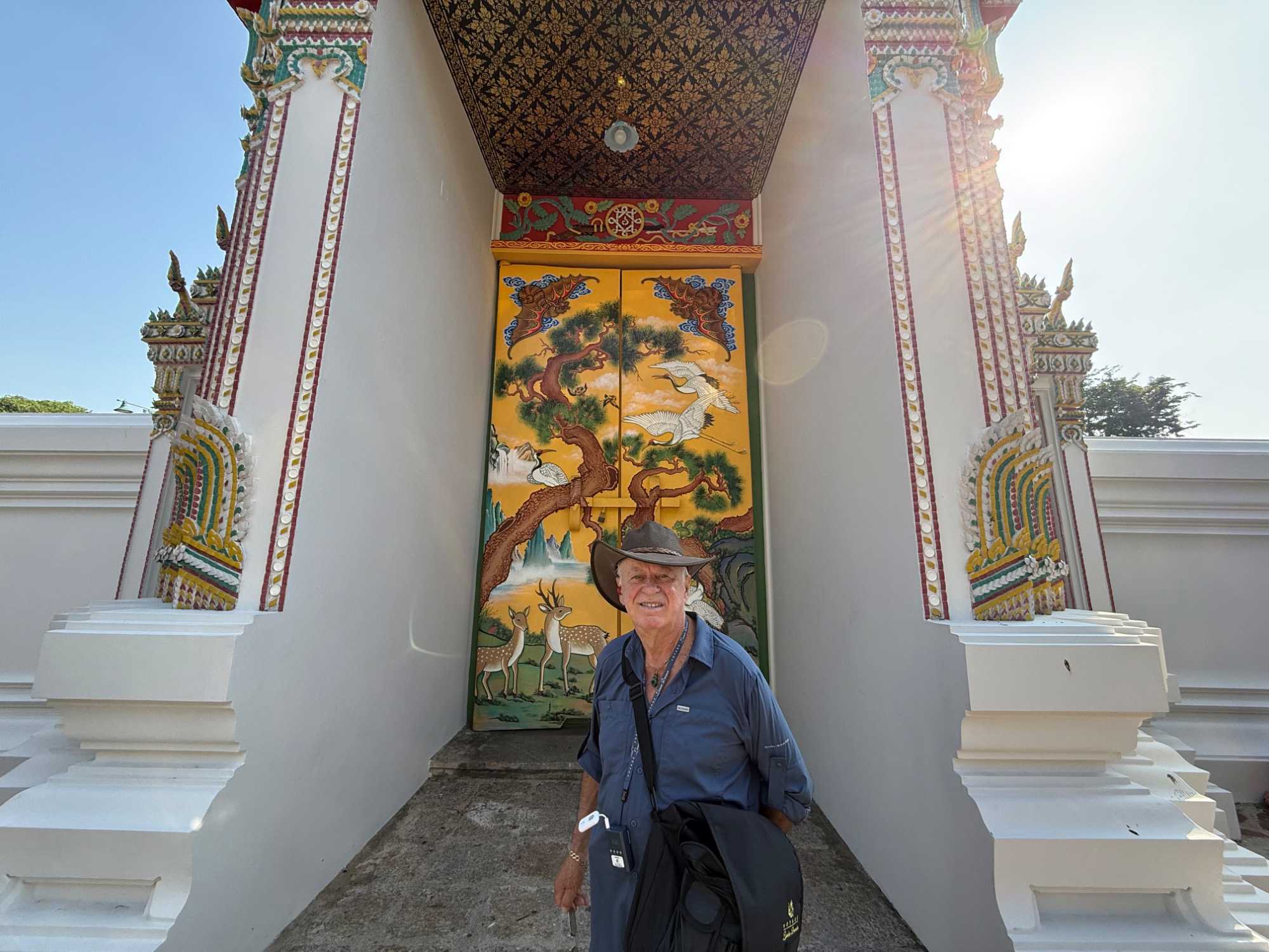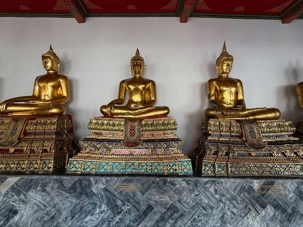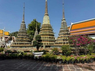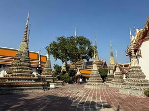 Le premier «Wat» que visitons est le temple du « Wat Pho »ou temple du Bouddha couché. D’une superficie de 8 hectares, il est situé à l’est de la Chao Phraya, immédiatement au sud du Palais royal. Il est l’un des plus vénérés temples bouddhistes de toute la Thaïlande et aussi un des plus anciens temples de Bangkok. Il abrite un grand Bouddha couché recouvert de feuilles d’or de la tête jusqu’aux pieds. Cette statue, plus grande que nature, est autant un chef-d’œuvre artistique qu’une symbolique religieuse et représente Bouddha couché sur son lit de mort et sur le point d’accéder au nirvâna. Cette statue fait 45 mètres de long et 15 mètres de haut. Nous sommes tous impressionnés dès que nous accédons à l’intérieur du temple. Une belle restauration est en cours et ils sont à terminer les pieds qui sont faits de nacre de perle et qui représentent les 108 états du bouddhisme en Thaïlande.