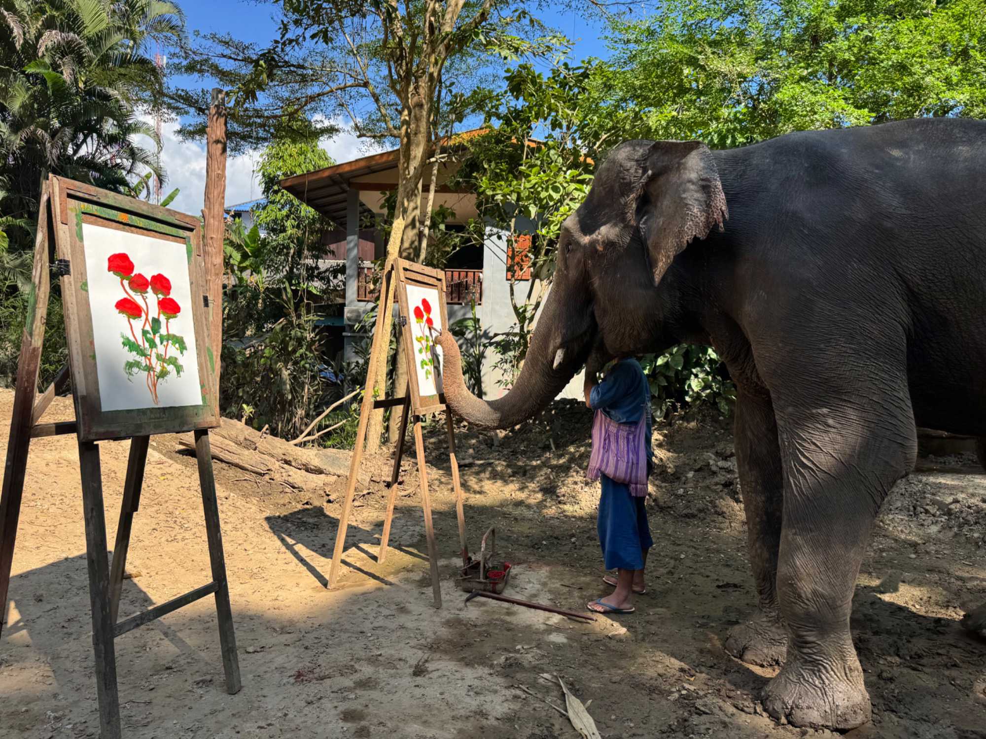 Nous les avons vus prendre un bain/une douche dans la rivière, leur routine quotidienne! Ensuite, nous avons eu droit à un spectacle impressionnant : danse, musique, soccer, peinture, et encore... Ils sont si intelligents! Imaginez un dessin fait par eux tout seul! Vous verrez les photos de leur œuvre finale. Ils sont tellement mignons et bien entrainés surtout.