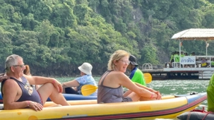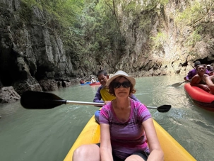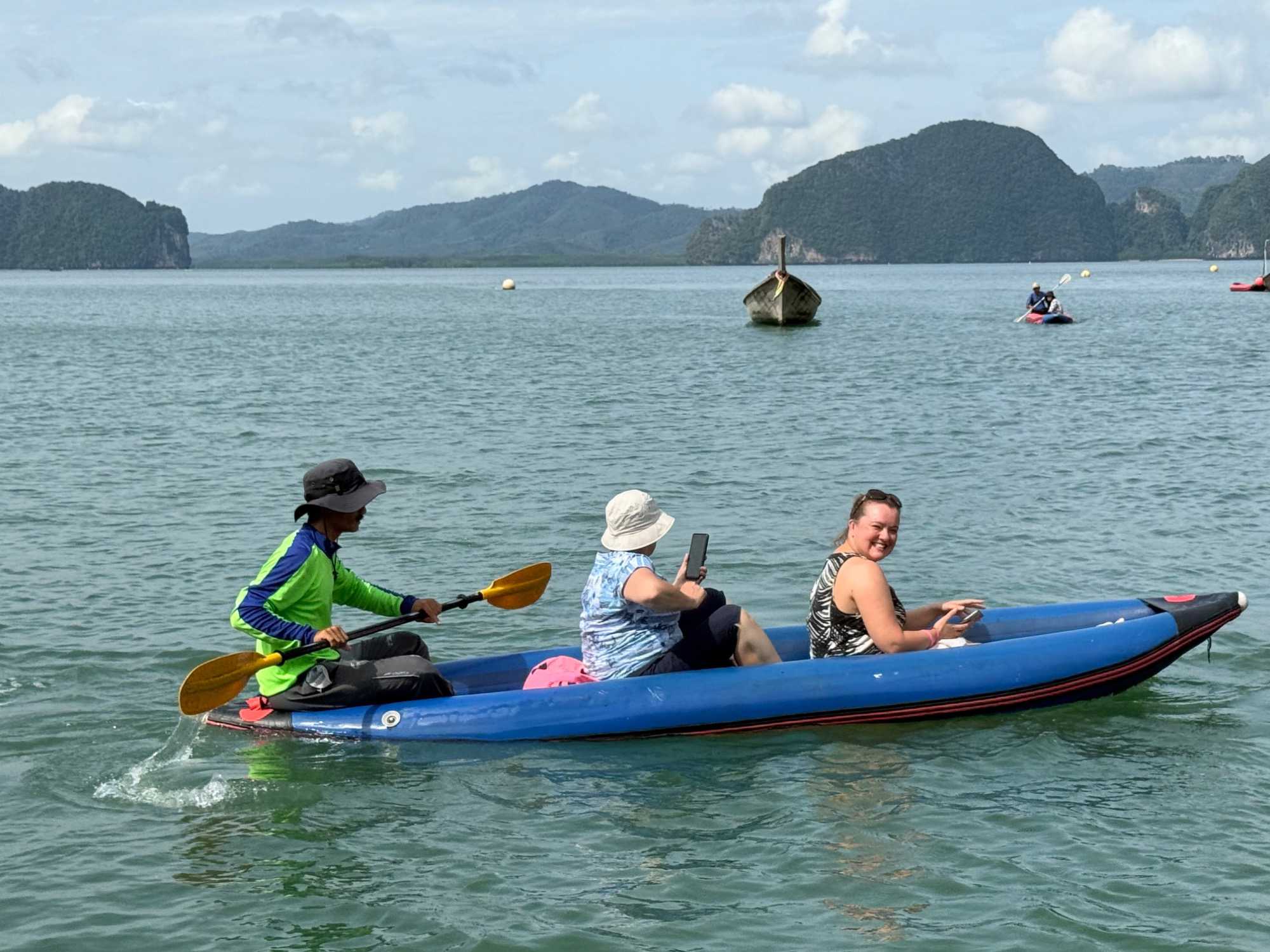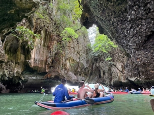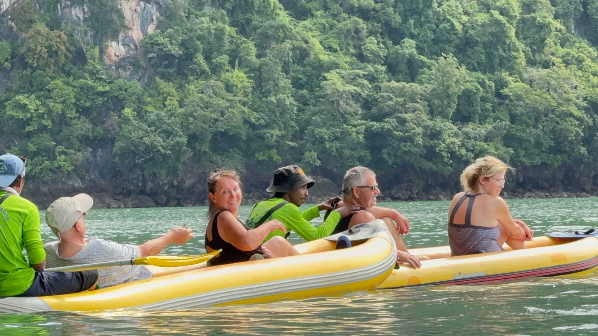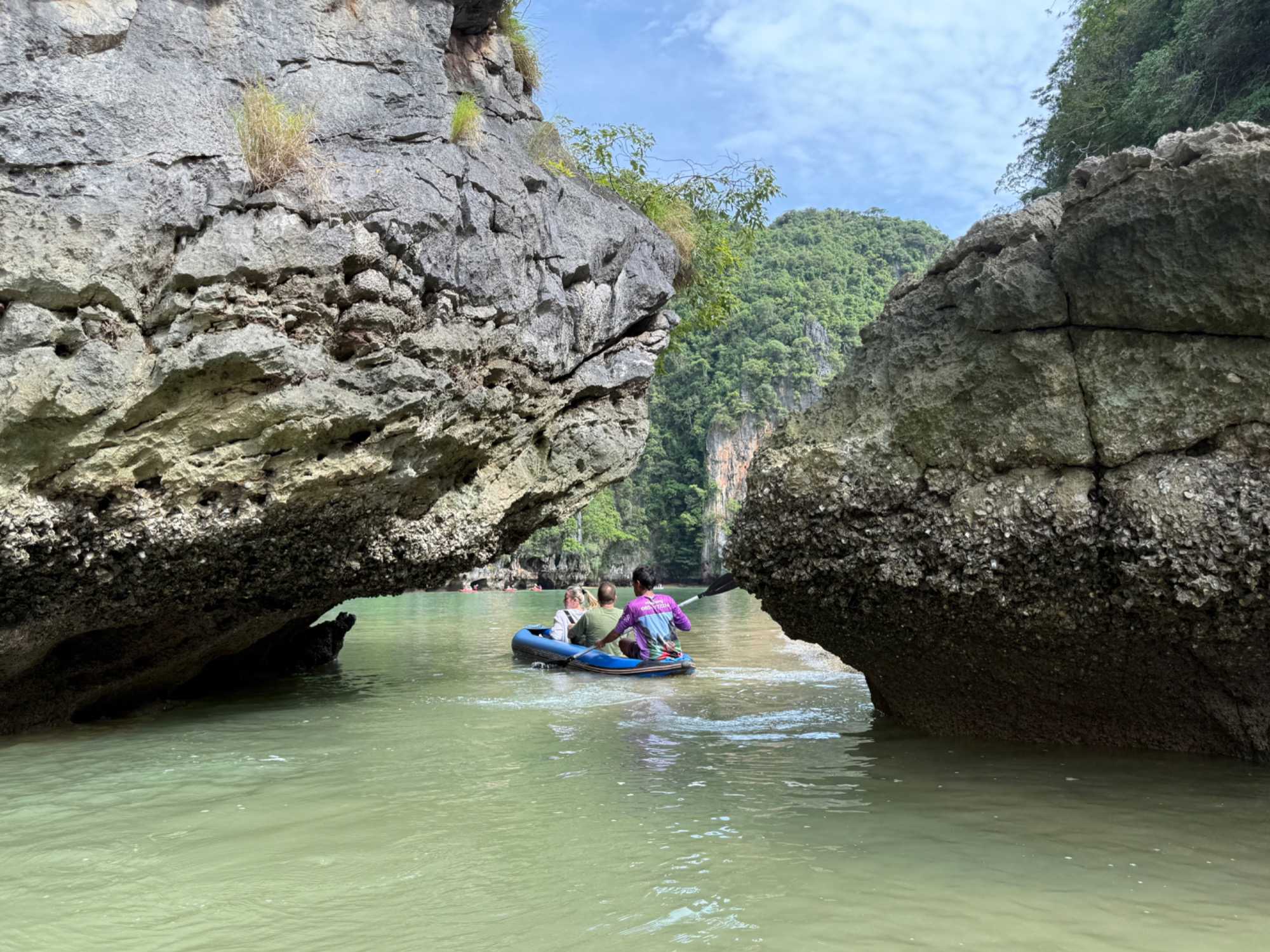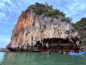 Nous faisons une première escale sur l’île de Kho-Hong. Cette île est située dans la baie de Phang Nga et le fait qu’elle soit moins visitée par les touristes, lui donne un aspect d’île vierge comme si jamais personne n’y avait mis les pieds auparavant. Ses paysages sont tout à fait époustouflants, un vrai décor de carte postale! Puis c’est à bord d’un canoë que 2 voyageurs accompagnés d’un rameur se déplacent tout doucement traversant dans les lagunes pour découvrir le magnifique paysage qui s’offre à leurs yeux . Au total, ce sont 11 canoës qui se suivent les uns avec les autres et je vous assure, tous vivent un moment complètement magique! Wow! Un autre moment tout à fait inoubliable qui restera longtemps gravé dans notre tête parmi tant d’autres belles images emmagasinées depuis le début de notre magnifique voyage en Thaïlande.