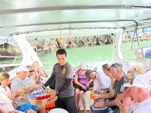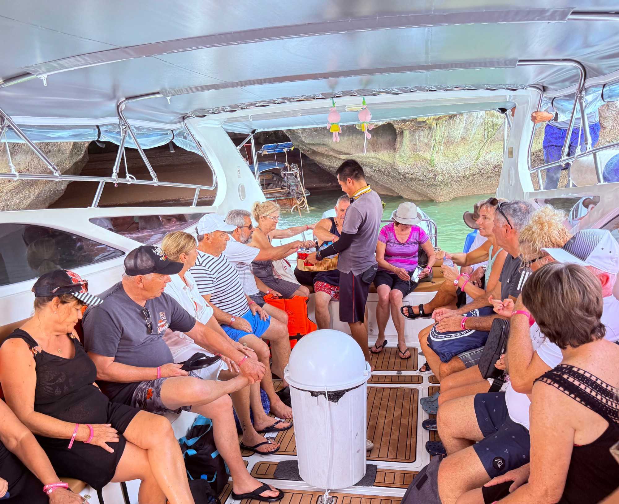Nous sommes ensuite tous montés à bord d’un bateau hors-bord privé pouvant se déplacer rapidement avec ses deux moteurs de 250 forces chacun et pouvant accueillir 35 passagers. Ce bateau est très bien aménagé ce qui nous permettra de faciliter nos déplacements plus rapidement. Les paysages sont superbes et nous prenons plusieurs photos de ces beaux rochers immergeant de la baie de Phang Nga.