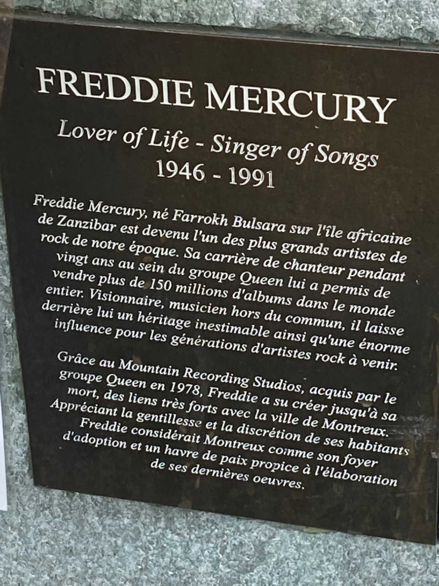 Tout comme Charlie Chaplin à Vevey, Freddie Mercury a lui aussi sa statue hommage sur les bords du lac Léman à Montreux. Réalisée par l’artiste Irena Sedleckà en 1996, elle représente le chanteur tel qu’il était vêtu en ouverture du mythique concert de Wembley en 1986. C’est aujourd’hui un lieu de pèlerinage pour les fans de Queen et elle est fleurie en permanence. Elle figure sur la pochette de l’album Made in Heaven.