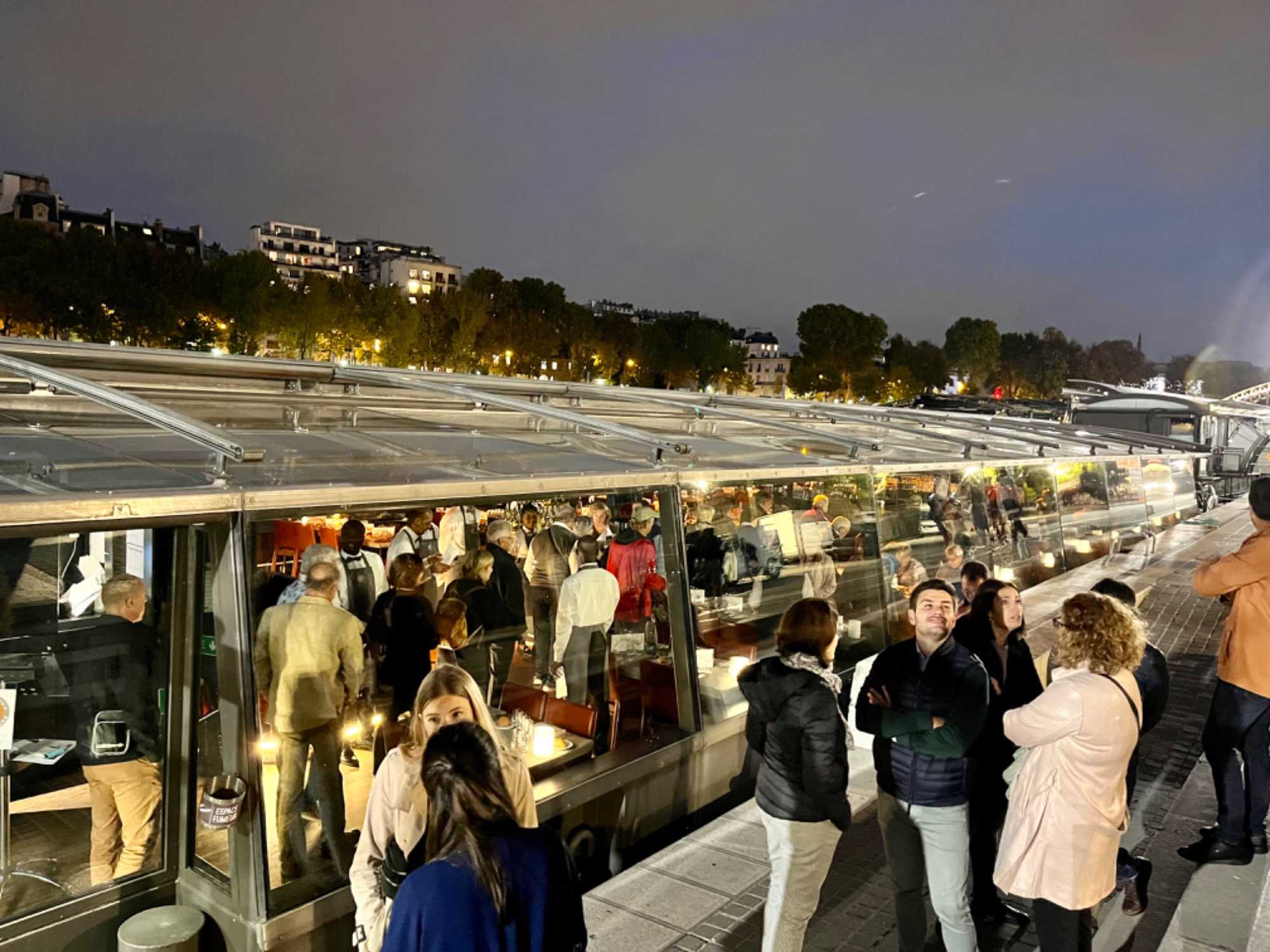 Puis, on se prépare pour un souper-croisière sur La Seine. Ce n’est pas n’importe quel souper-croisière! Il s’agit d’un souper-croisière finement choisi par Louise Drouin! En effet, elle nous a réservé une belle surprise en choisissant les tables près des fenêtres, la coupe de kir en apéritif, une sélection de vins fins pour accompagner notre repas, des plats succulents et le dessert… Nous sommes vraiment choyés. La croisière sur la Seine nous fait faire un tour de la ville illuminée par tous ces monuments, dont bien sûr la célèbre Tour Eiffel.