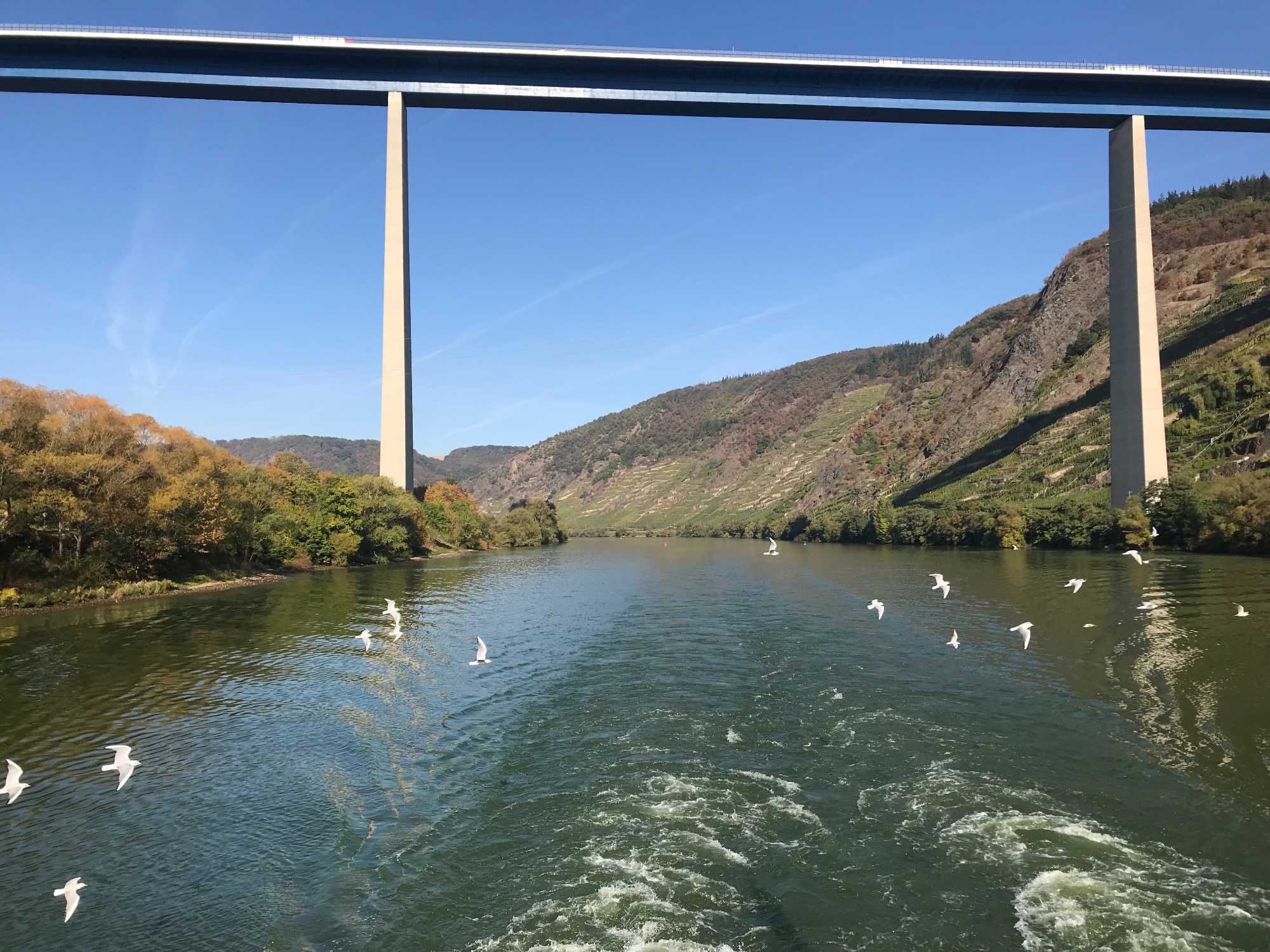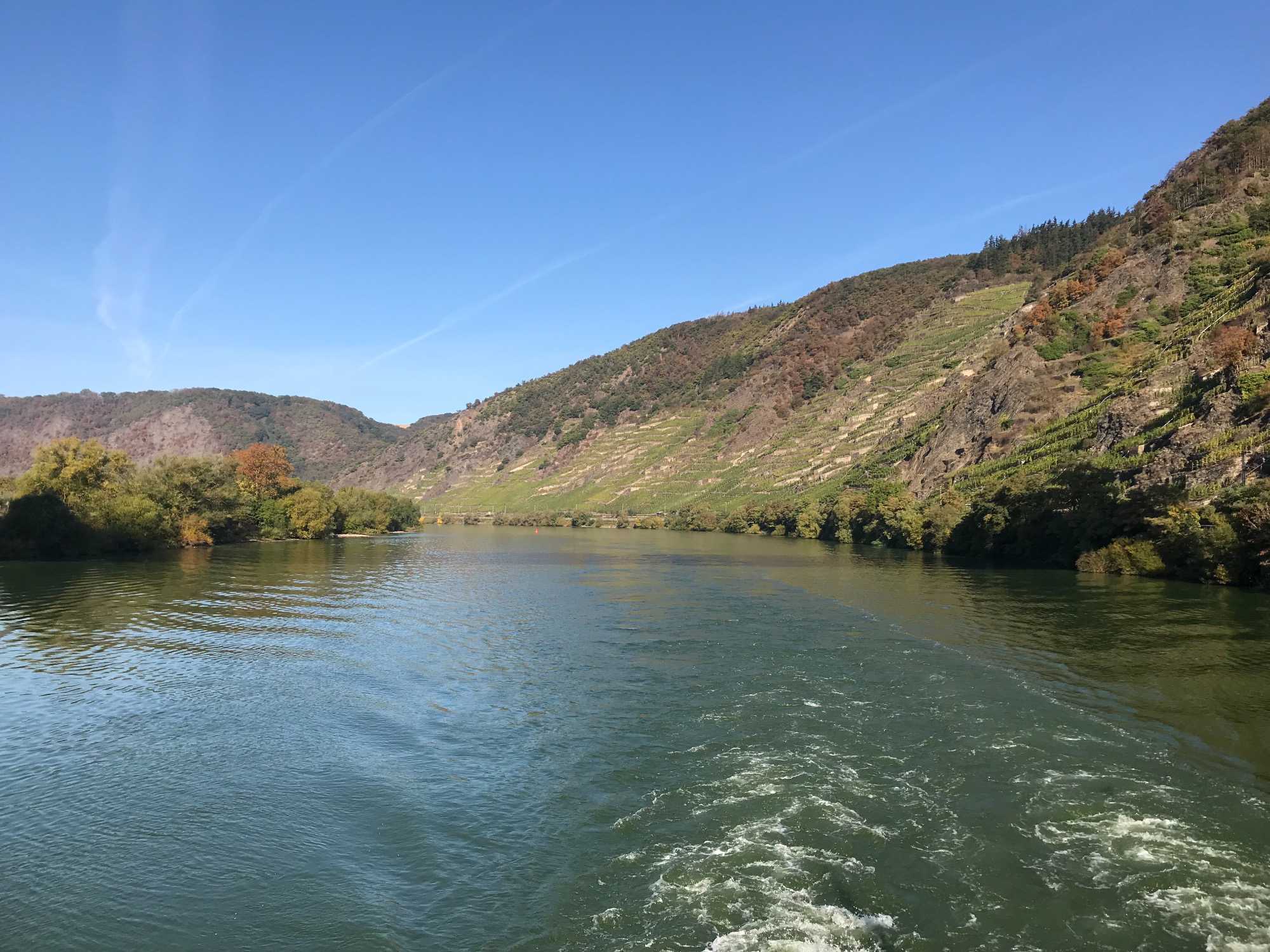 Ce matin, nous poursuivons notre navigation sur la Moselle en revenant vers le Rhin. Nous voyons des paysages bucoliques que nous n'avons pu voir hier car nous naviguions de nuit.