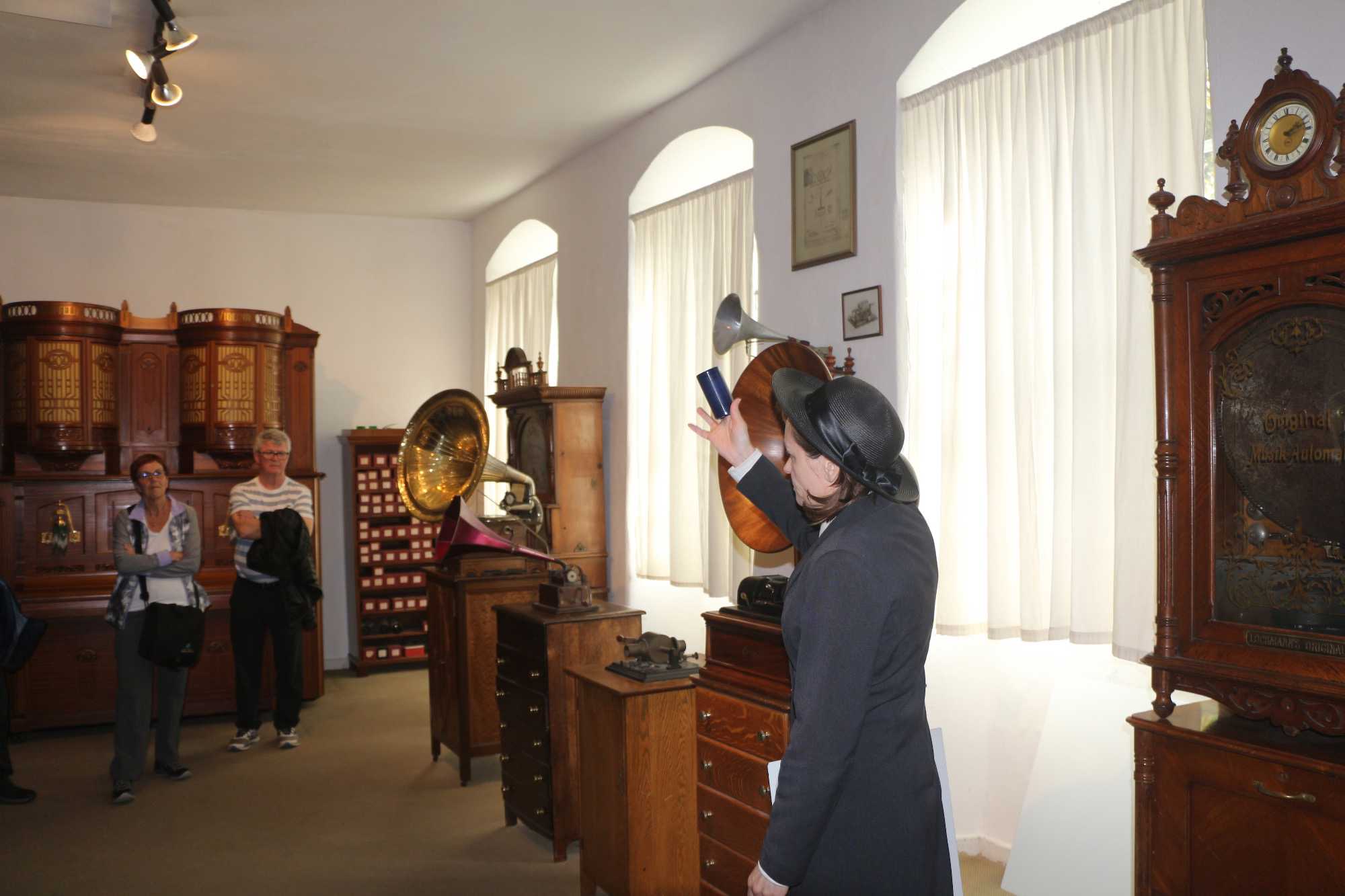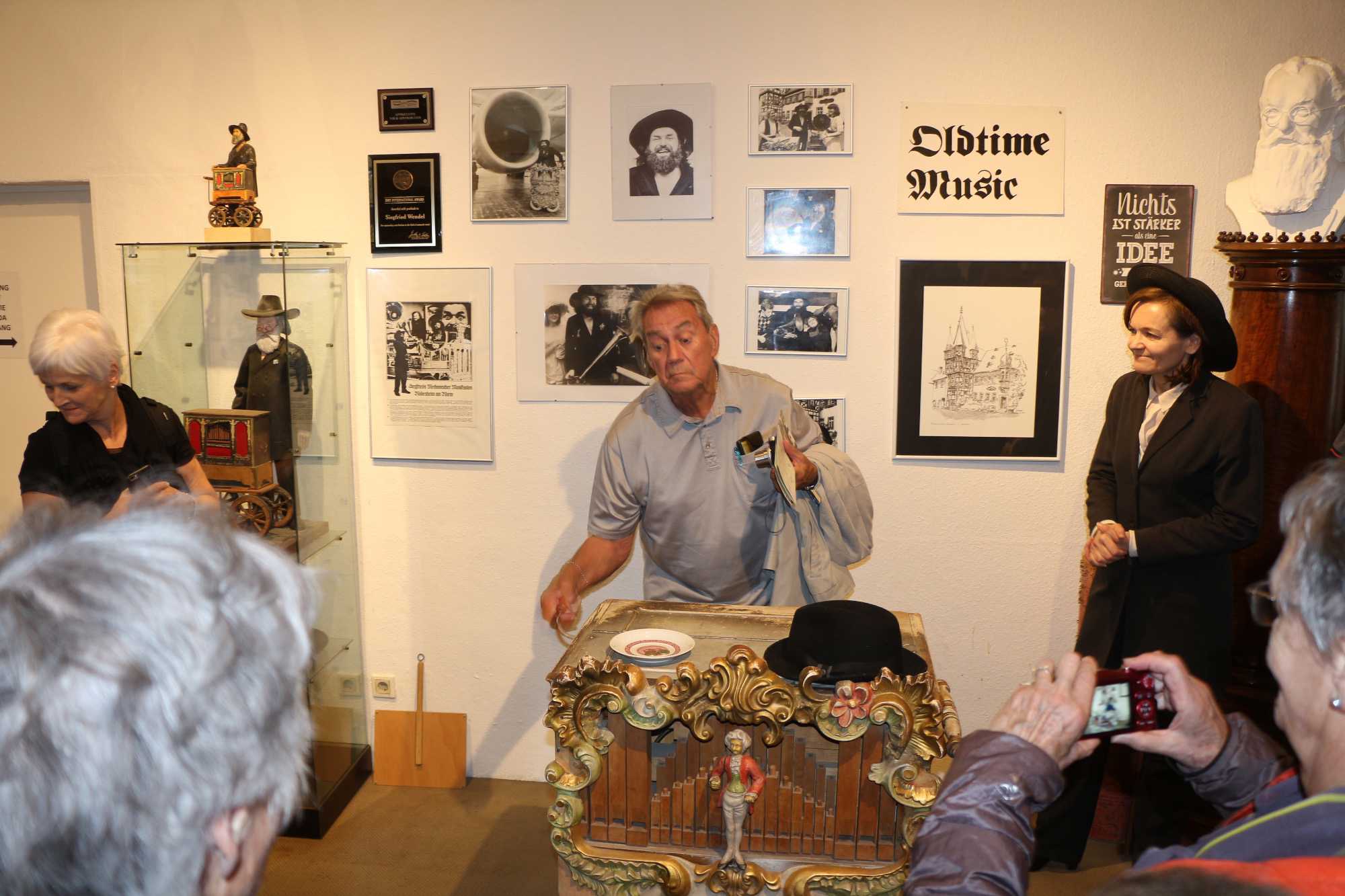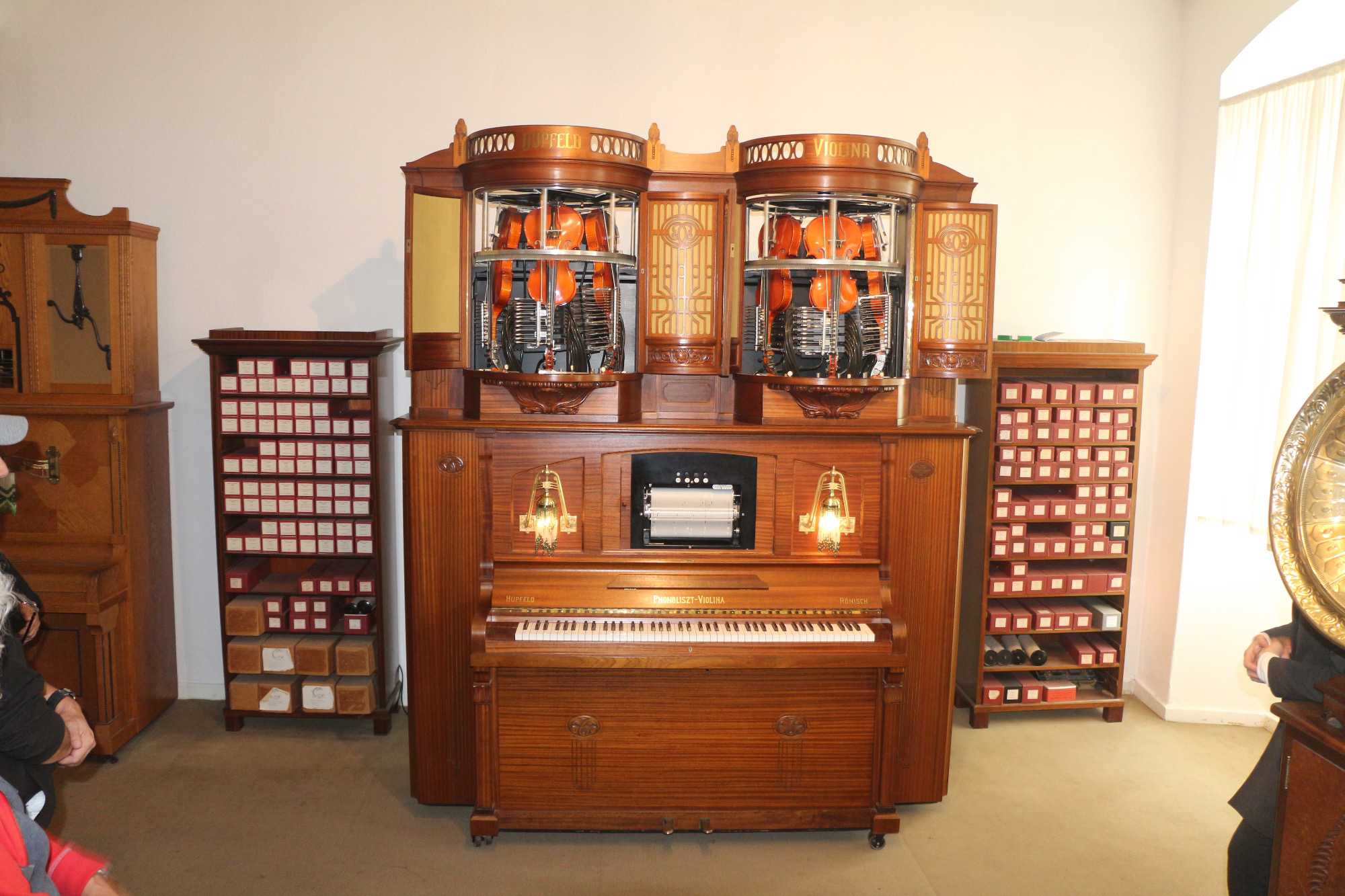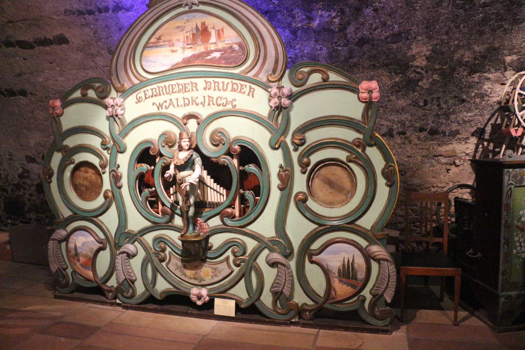 Le petit train s'arrête ensuite juste devant le Musée des Instruments de Musique Mécanique. Le « Siegfrieds Mechanisches Musikkabinett » est le premier musée allemand consacré aux instruments de musique à mémoire. De la douce boîte de musique au titanesque orchestrion concert-piano, ce ne sont pas moins de 350 instruments automatiques qui y sont réunis pour constituer l'une des plus grandes et des plus belles collections du XVIIIe au XXe siècle exposées sur plus de 400 m². On peut aussi y admirer des outils et des machines utilisés pour fabriquer les cylindres d'orgue, les cartons et les rouleaux de note et les plaques de boîte à musique. Quel que soit notre âge, nous prenons un grand plaisir à découvrir cette musique si particulière, les techniques d'antan et la façon dont fonctionnent ces instruments. Une belle petite surprise attendait aussi nos voyageurs. Voyage Louise Drouin les a gâtés un peu...