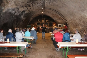 Après la visite du Musée des Instruments de Musique Mécanique, nous nous sommes dirigés à 100m de là, vers la cave historique du Bassenheimer Hof, demeure seigneuriale du 16e siècle, dans laquelle nous participons à une dégustation de vin. C'est un vigneron de la cave de la famille Störzel, qui nous fait découvrir trois vins, du plus sec au plus doux, en nous parlant de l'histoire de la cave et de la viticulture dans la région et en nous racontant quelques anecdotes locales.