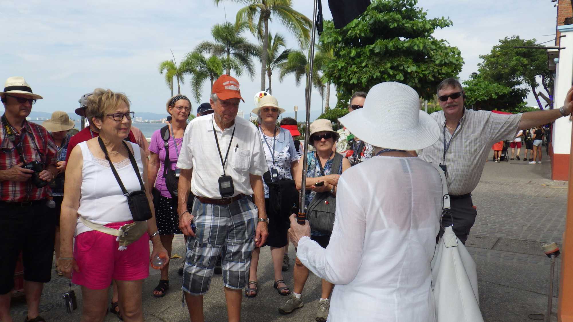 Nous avions planifié notre tour de ville à 13 h, pour la découverte de Puerto Vallarta. Tous nos voyageurs étaient au rendez-vous à 12 h 45, crémeux, bien hydratés, chapeaux et audioguides bien en main.
