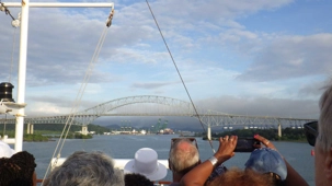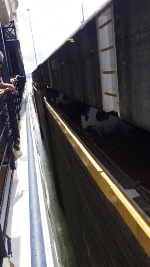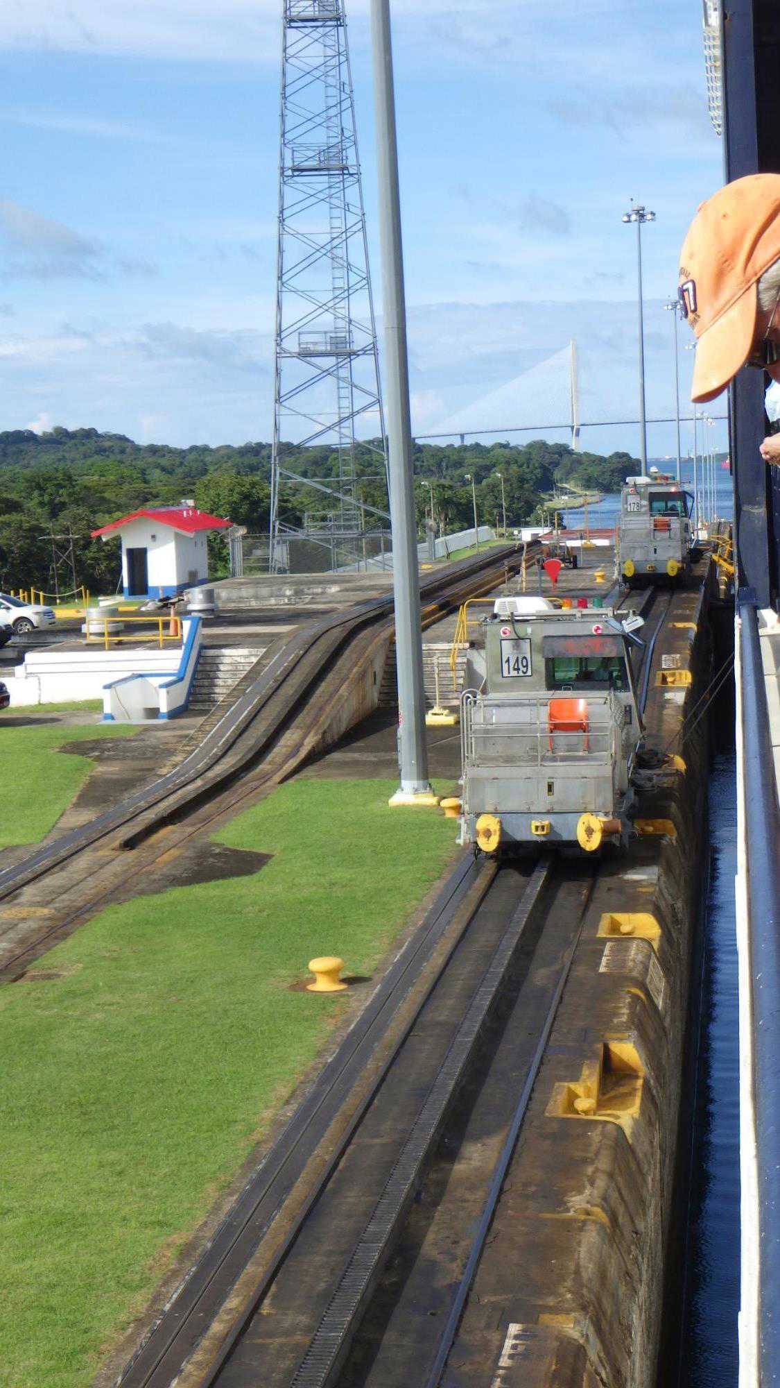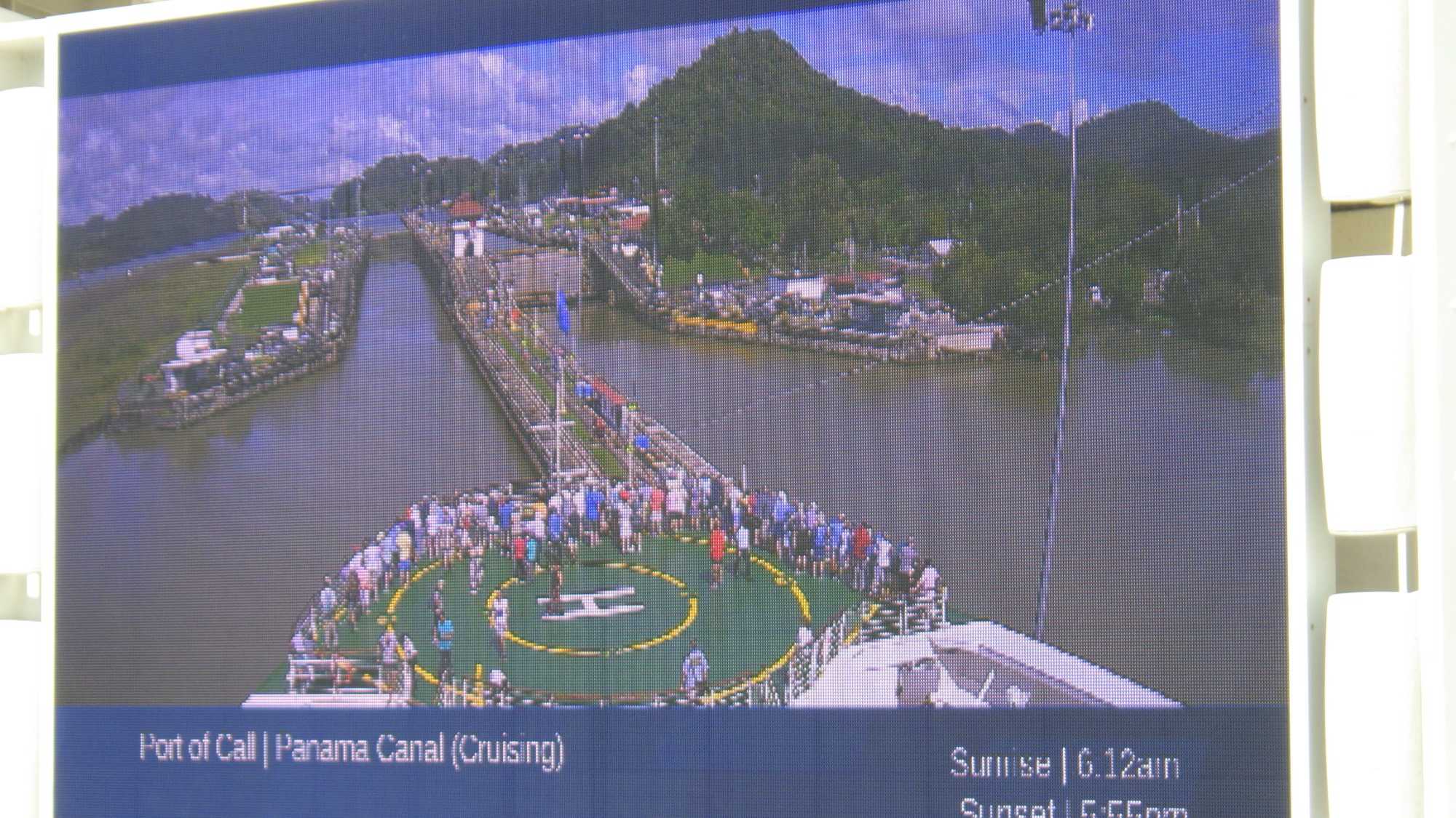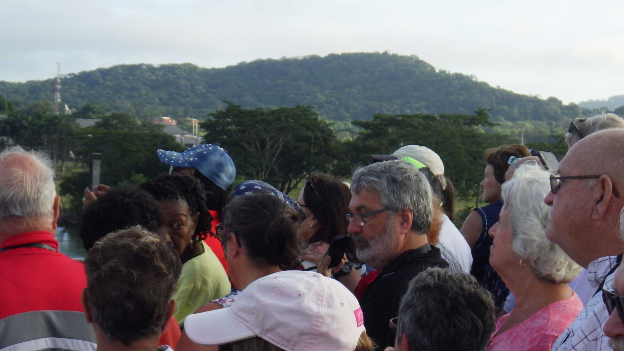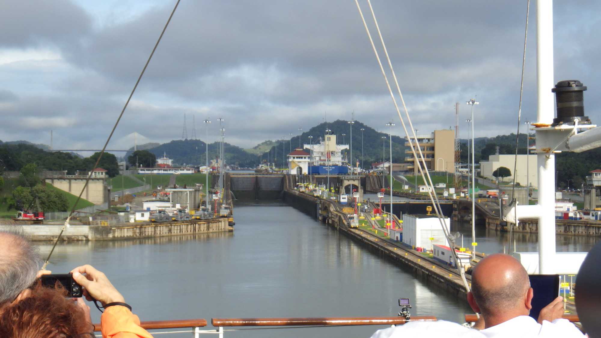 Déjà à 6 h 00 ce matin il y avait de l’effervescence sur le navire. Plusieurs de mes voyageurs étaient à l’extérieur. Ce matin le navire est arrivé à Balboa à 6 h 30, ensuite le pilote est monté à bord pour se présenter à la première étape du canal, soit à l'écluse Miraflores à 8 h 30. Peu de temps après, nous sommes entrés dans l’écluse Pedro Miguel vers 9 h 40. Par la suite, après un parcours de plusieurs milles, nous sommes entrés dans le passage de Gamboa et Gatun Lake. À 14 h 00, l’écluse de Gatun nous attendait, pour ensuite sortir dans l’Atlantique à Cristobal vers 16 h 50. Tout au long de la journée, il y a eu un commentateur pour nous donner des explications sur le canal. Nous avons donc admiré le processus du passage des écluses, une après l’autre. Il faut dire que nous avons été le seul navire de passagers à traverser le canal et que les autres navires n'étaient pas aussi beaux que le nôtre, mais peut-être plus colorés avec tous leurs conteneurs.