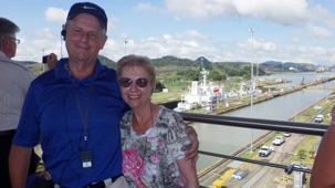 Nous débutons notre excursion par la visite des écluses de Miraflores. Les Panaméens sont très fiers d'avoir obtenu le plein contrôle de la gestion et de l'administration du Canal en 1999. Nous montons à l'étage supérieur pour observer le Canal dans lequel un cargo chargé de conteneurs est entré pour se diriger vers l'océan Atlantique. C'est intéressant de voir l'écluse sous un autre angle à partir du quatrième étage du côté sud. En descendant l'escalier, on peut voir des maquettes de ces cargos géants pouvant contenir jusqu'à 13 000 conteneurs. C'est pour eux que le nouveau Canal a été construit.