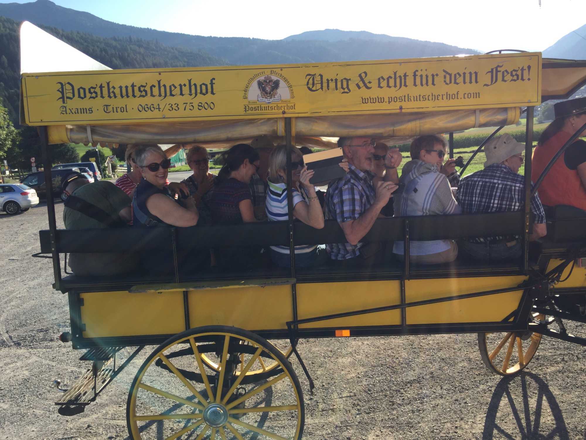 Nous reprenons la route d’Axams, commune de plus de 5000 habitants dans le district d’Innsbruck, paradis de la randonnée et du VTT, où nous faisons une balade en calèche en compagnie de Fritz, le 1er cocher de notoriété internationale. Cette balade s’est terminée par un schnaps en l’honneur de Fritz. Vous comprendrez que l'ambiance s’est mise de la partie!