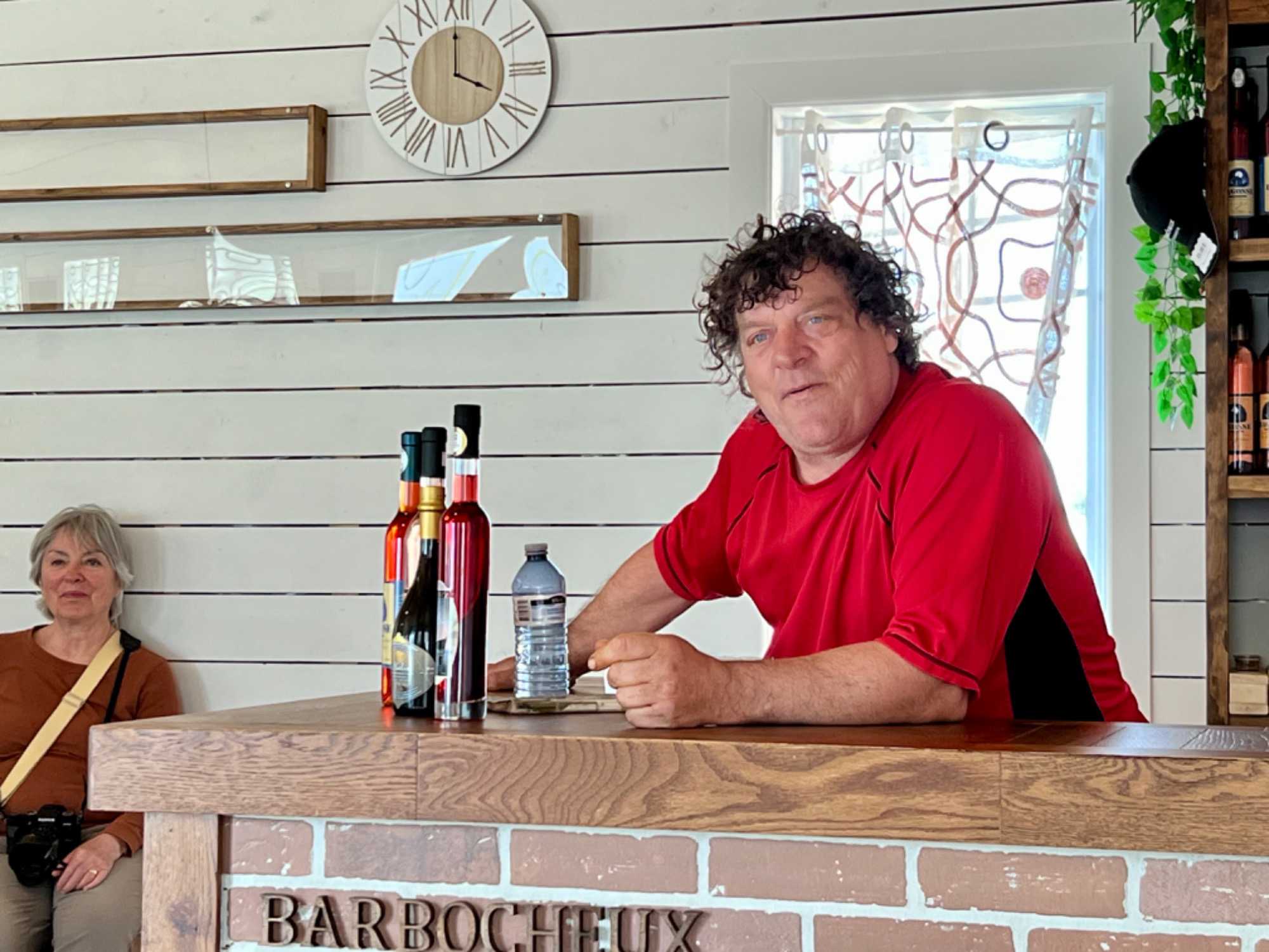 Après un bon 45 minutes à déambuler à l'Etang-du-nord, destination Le Barbocheux à la rencontre du colorée Léonce. Nous allons donc prendre l’apéro chez « Le Barbocheux » pour déguster la « Bagosse » à Léonce!. Tout un personnage ce Léonce Arsenault qui nous présente avec humour ses produits. Cette entreprise se spécialise dans la production de boissons artisanale. Le Barbocheux, nom de l’entreprise, est un vieux mot des Îles qui vient de " Barbocher" , qui signifiait aller prendre un p'tit verre de maison en maison (aller barbocher). La bagosse communément appelé «bière des Iles», est un vin de fruit qui a toujours fait partie des moeurs des habitants. À cause de l'isolement, la bagosse fut longtemps la seule boisson alcoolique aux Îles. Chaque famille avait sa recette et chaque événement social était salué avec la bagosse.