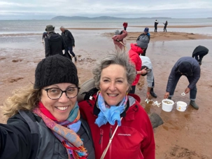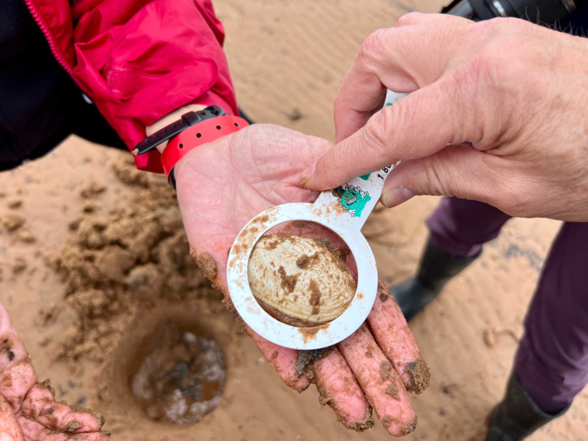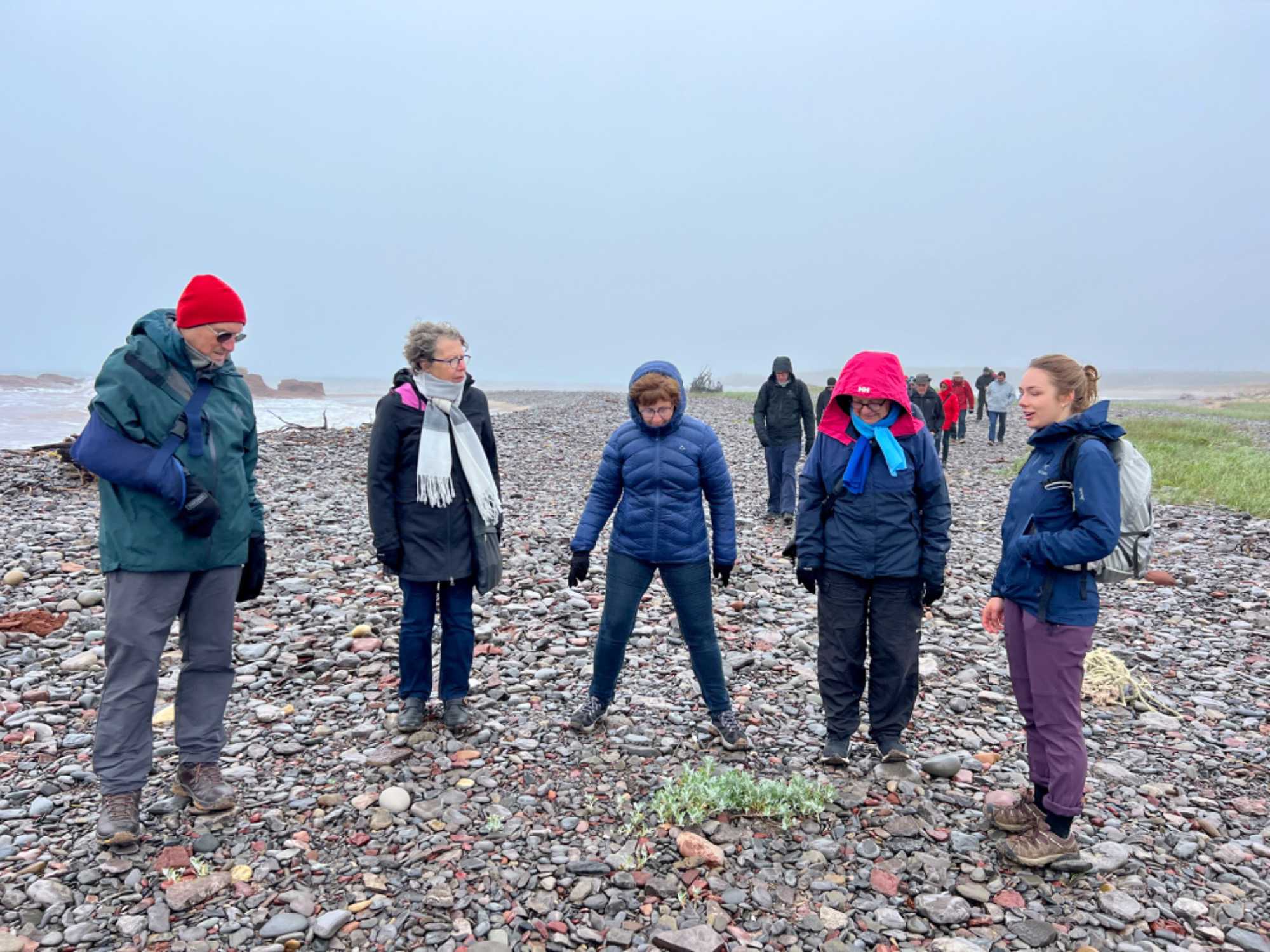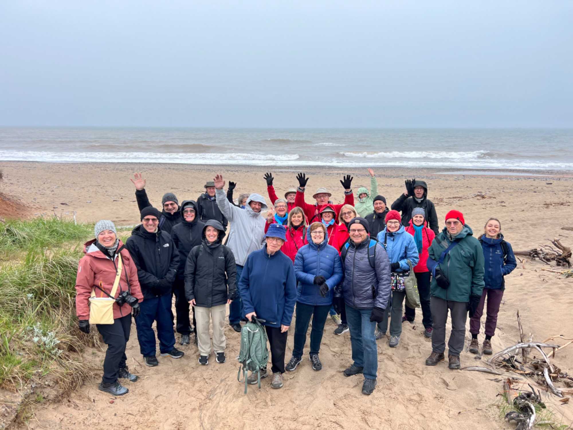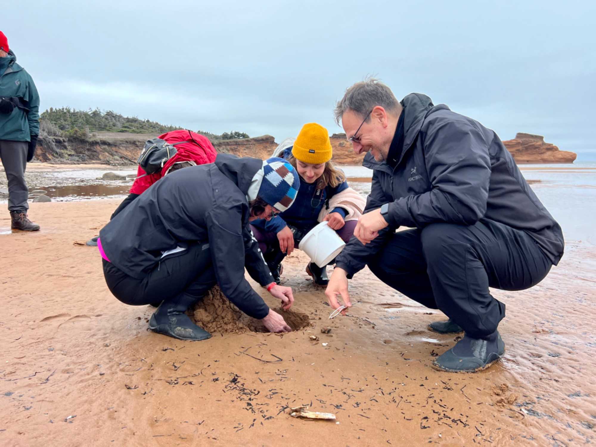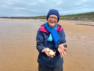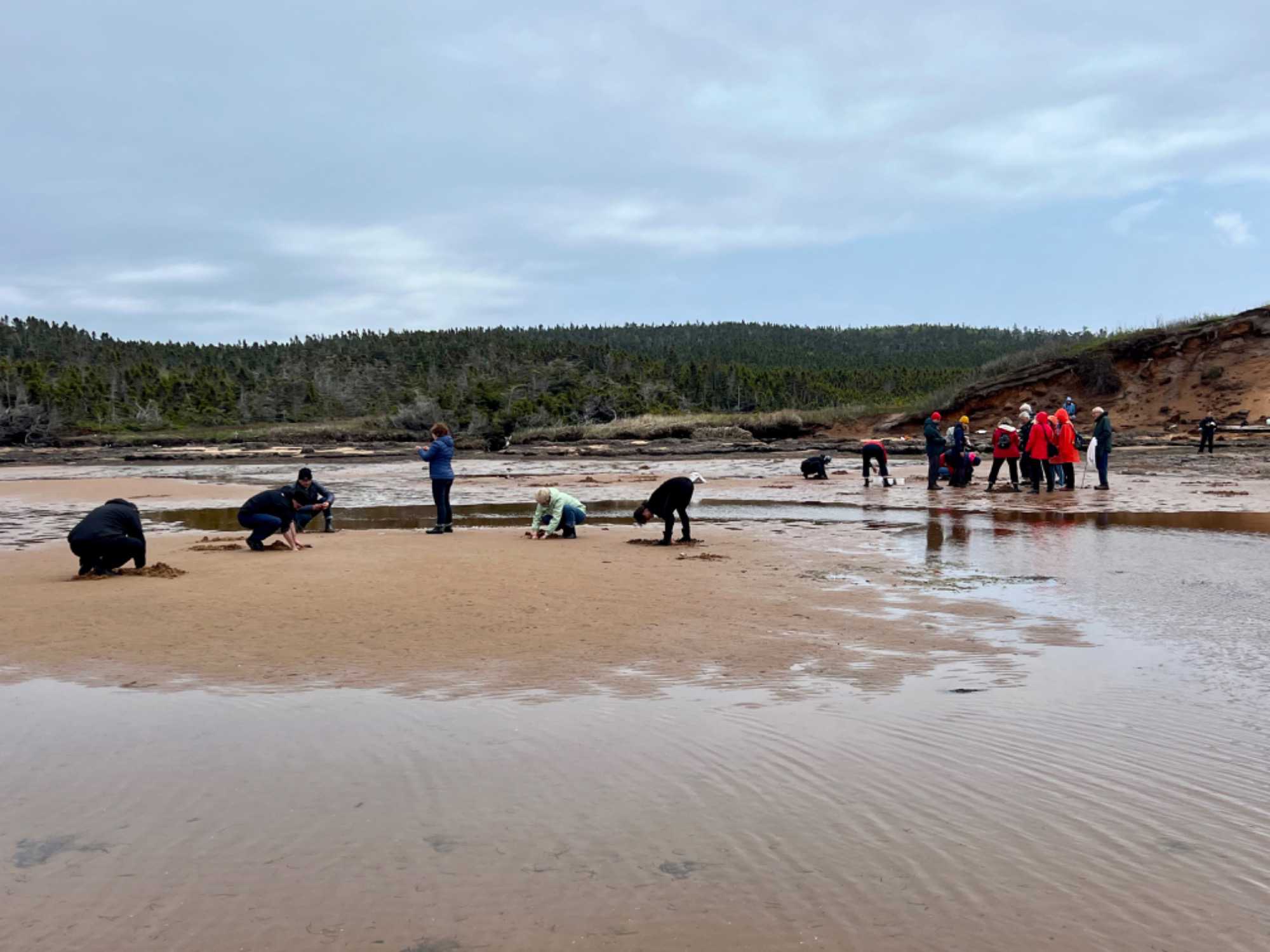 Déjà le début de l'après-midi et, pour ceux qui le veulent, nous repartirons en bus pas très loin pour aller vivre la fameuse pêche aux coques des îles de la Madeleine. Pêche pratiquée ici régulièrement par ses habitants. What an experience! On aura pris soin de mettre des bottes en Néoprène pour nous protéger du froid avant de s'avancer sur le sable. Cette pêche doit être faite à marée basse. Quel plaisir nous avons de la découvrir! Pêche qui ne se fait pas avec une canne et une ligne à pêche! Et non, il faut creuser dans le fond de la mer pour trouver des coques, une activité estivale très attendue à l’Île, et c’est vraiment amusant. La saison de la pêche aux coques commence en mai et se termine en octobre. Le meilleur temps pour la pêche est pendant la marée basse lorsque la mer recouvre une moins grande partie de la plage. Sachez qu'une règlementation en vigueur depuis 2004 permet la cueillette récréative de 300 coques d'une taille minimale de 51 mm (2 pouces) par jour et par individu. Certains de nos amis auront plutôt opté pour nous regarder, encourager ou nous prendre en photos.