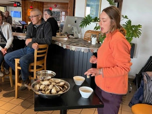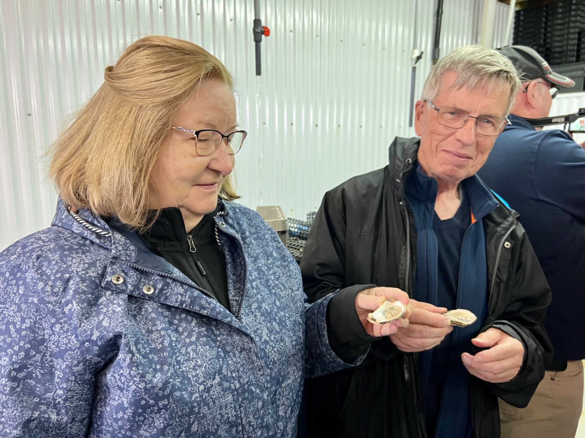 On rebrousse chemin car nous devons revenir à l'auberge chercher nos amis restés là-bas et retourner encore une fois au port de Grande-Entrée où le très gentil (et beau!) Carlo nous attend pour participer à une dégustation d’huîtres, exclusive à notre groupe, directement sur le site du mariculteur. Wow! Quelle belle découverte! Carlo nous a partagé de façon intéressante son histoire de la culture des moules, qui a été remplacée par la culture des huîtres. Des mariculteurs des Îles-de-la-Madeleine deviennent les premiers à commercialiser une huître du Québec. Ils travaillent très dur pour arriver à produire ces délicieuses huîtres localement. Les jeunes huîtres mises en élevage mesurent 35 millimètres. Elles sont placées dans des cages immergées en mer. Les mariculteurs les visitent régulièrement pour les reclasser par taille. Les mollusques prennent de cinq à six ans pour atteindre la taille commerciale de 75 millimètres, soit le format dit « choice ». Nous avons dégusté ces délicieuses huîtres qui ont un goût un peu plus salé compte tenu de leur élevage en bassin d’eau de mer naturelle. Nous les retrouvons au Québec sous la marque « Huîtres de la Grande-Entrée » et c’est un excellent produit local à découvrir.