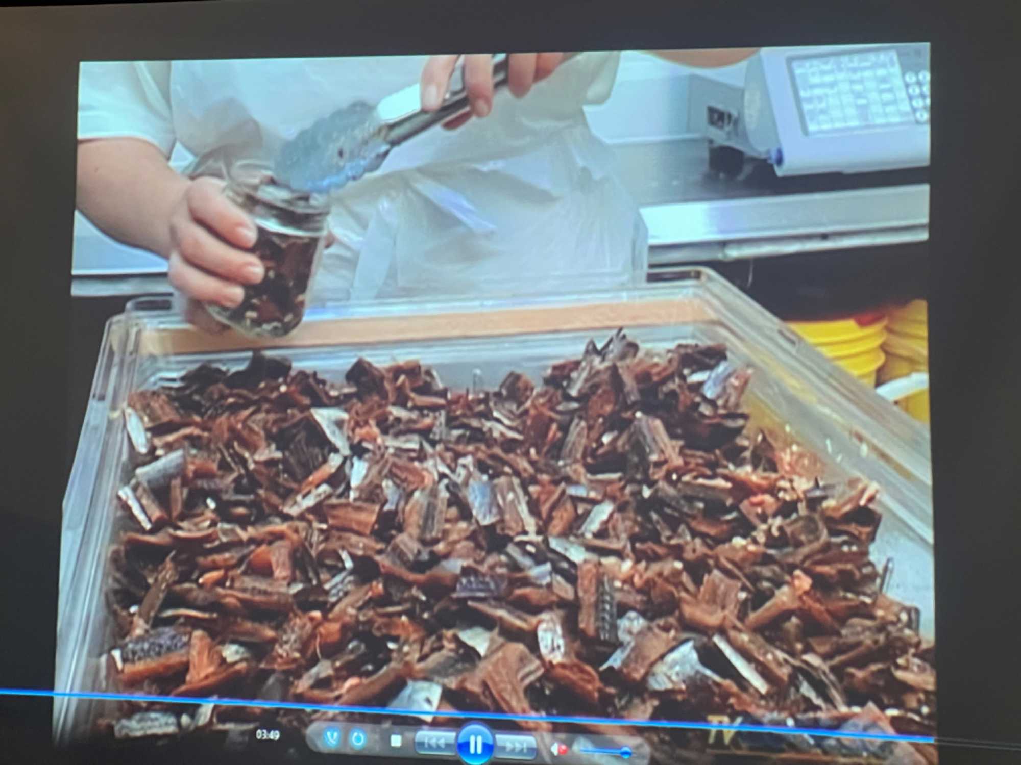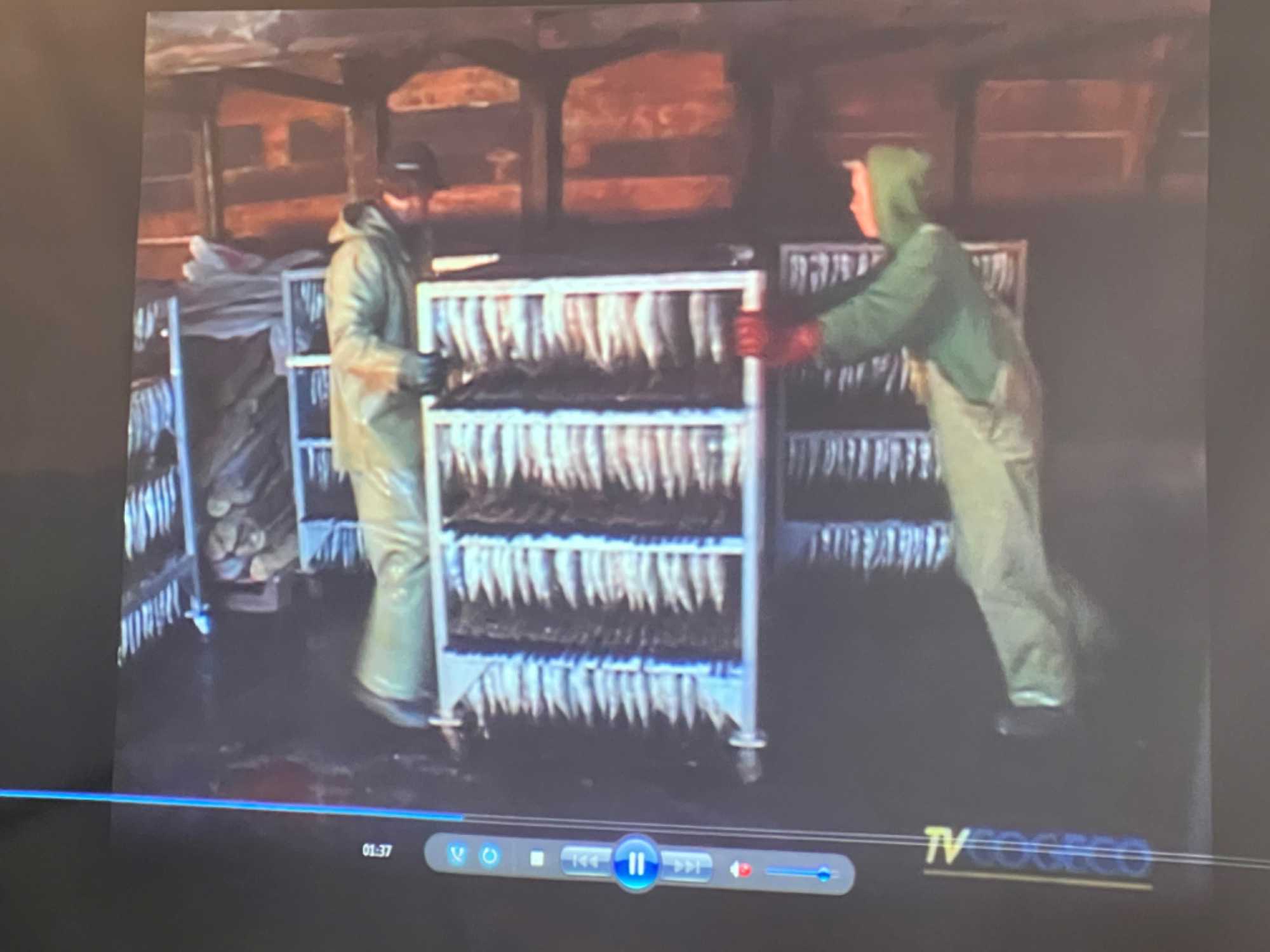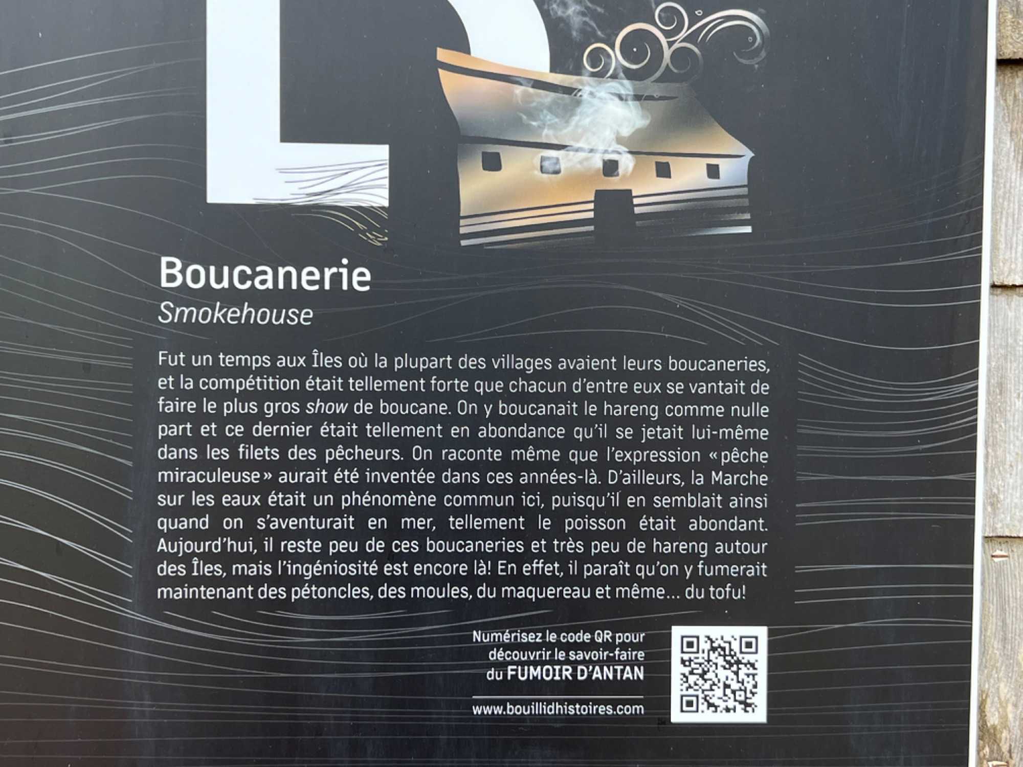 Le Fumoir d’Antan qui lui aussi est un économusée. On nous a expliqué l’art du boucanage. En 1996, avec le retour du hareng autour des Îles, les activités de la boucanerie de la Pointe-Basse sont relancées par les frères Arseneau. Leur désir premier étant de conserver les bâtiments familiaux et de faire revivre la technique du boucanage traditionnel. La méthode ancestrale du boucanage du hareng, transmise de père en fils, garantit l’authenticité et la qualité des produits de terroir offerts au Fumoir d’Antan. C’est au 19e siècle que la technique de boucanage du hareng est introduite aux Îles-de-la-Madeleine. Après les informations qu’on nous a transmises, nous avons dégusté trois de leurs produits qui étaient tous délicieux. Merci à Jules pour tes enseignements forts intéressants.