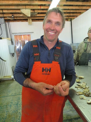 Puis on retourne au port de Grande-Entrée où le très gentil (et beau!) Carlo nous attend pour participer à une dégustation d’huîtres, exclusive à notre groupe, directement sur le site du mariculteur. Wow! Quelle belle découverte! Carlo nous a partagé de façon interessante son histoire de la culture des moules, qui a été remplacée par la culture des huîtres. Des mariculteurs des Îles-de-la-Madeleine deviennent les premiers à commercialiser une huître du Québec. Ils travaillent très dur pour arriver à produire ces délicieuses huîtres localement. Les jeunes huîtres mises en élevage mesurent 35 millimètres. Elles sont placées dans des cages immergées en mer. Les mariculteurs les visitent régulièrement pour les reclasser par taille. Les mollusques prennent de cinq à six ans pour atteindre la taille commerciale de 75 millimètres, soit le format dit « choice ». Nous avons dégusté ces délicieuses huîtres qui ont un goût un peu plus salé compte tenu de leur élevage en bassin d’eau de mer naturelle. Nous les retrouvons au Québec sous la marque « Huîtres de la Grande-Entrée » et c’est un excellent produit local à découvrir.