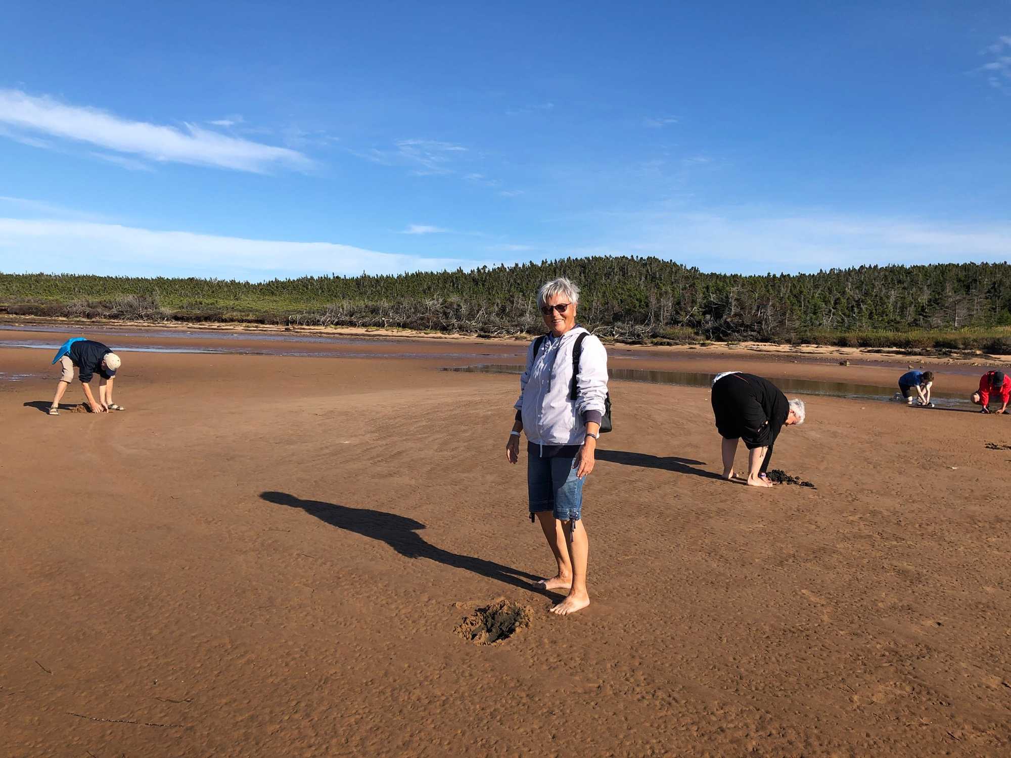 La pêche aux coques (myes), (très rare sont les groupes qui vont aux Îles et qui peuvent vivre cette expérience… c’est ce qu’on appelle vivre les Îles)… on ne vous mentait pas lorsqu’on vous a dit qu’aller creuser pour trouver des coques, une activité estivale très attendue à l’Île, c’est vraiment amusant. La saison de la pêche aux coques commence en mai et se termine en octobre. Le meilleur temps pour la pêche est pendant la marée basse lorsque la mer recouvre une moins grande partie de la plage. Sachez qu'une réglementation en vigueur depuis 2004 permet la cueillette récréative de 300 coques d'une taille minimale de 51 mm (2 pouces) par jour et par individu. Notre super ramasseuse de coques fût Gladis, qui nous a même montré comment pêcher les couteaux de mer avec 3 couteaux… Je peux sincèrement dire que tous ceux et celles qui ont participé à l’activité ont tout simplement adoré retourner en enfance…