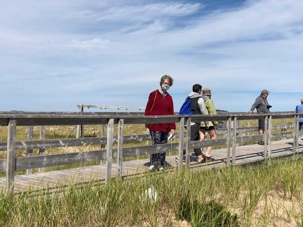 Fini de découvrir cette bien triste réalité, nous retournons dans notre havre de paix où nous attendent les cuisinières et les employés tout aussi heureux les uns que les autres de nous recevoir. Ce midi nous avions deux choix comme toujours et les amateurs de poissons ont bien entendu choisi les galettes de poissons à la morue. C’était délicieux! Déjà le moment de repartir pour découvrir la magnifique « plage de la Grande Échouerie ». Un court arrêt à la fin de cette plage afin d’avoir un point de vue sur la mer avec une petite plage et surtout de très beaux rochers orangers. À cet endroit, il y avait un ancien quai avec de nombreux piliers, qui servent normalement à la construction d’un quai et qui étaient entassés sur le littoral. Si l’on pense à une valeur de plus de 1000 $ par bloc bien le gouvernement a laissé beaucoup d’argent dormir là. Il y a plus de 1000 piliers, d’après Josée. Puis c’est le temps de marcher les pieds dans l’eau (pour ceux qui le désirent) c’est toujours très impressionnant de découvrir la longueur de la plage. Si l’on désire marcher, c’est la bonne plage car on pourrait marcher 21 km en suivant la mer et espérer un transport sur roues au retour. N’oubliez pas : Il faut marcher en se laissant trainer les pieds, cela fait chanter le sable.. En plus, remarquez que ce sable n’est jamais vraiment chaud ni brulant c’est plus comme marcher dans de la farine, tellement le grain de sable est fin…