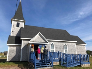 De l’autre côté de la rue se trouvait, avec une vue extraordinaire sur les falaises rouges, la Seacow Path et Josée nous a bien expliqué l’histoire des morses. Vive les audios-guides car le vent et le son de la mer plus la distanciation sociale… cela facilite le travail de notre guide. Tout près se trouvait l’église St Peter’s de Old Henry, l'église Saint-Peter's-By-the-Sea, citée monument historique, est un lieu de culte de tradition anglicane érigée en 1916 et 1917. D'influence néogothique, le temple se compose d'une nef de plan rectangulaire terminée par un choeur en saillie à chevet plat et est coiffé d'un toit à deux versants droits. Il se distingue par l'aménagement d'une tour clocher demi-hors-œuvre avec allonges dans l'un des murs pignons et d'un porche sur l'un des longs pans. L'église et un cimetière adjacent sont situés dans le hameau d'Old-Harry aujourd'hui compris dans la municipalité de Grosse-Île. Mais ce qui est impressionnant lorsque nous passons la porte offerte en l’honneur d’un jeune homme de 20 ans qui aurait sauvé de la noyade deux jeunes filles. Magnifiques portes de bois sculptées qui nous laissent entrer dans une petite église ornée de photos de madelinots ayant perdu la vie en mer. Impressionnant de voir tant de photos de ce peuple de marins. On peut aussi y voir plusieurs navires ayant fait naufrage. L’on réalise que leur vie c’est la mer mais que cette dernière peut aussi être bien cruelle.