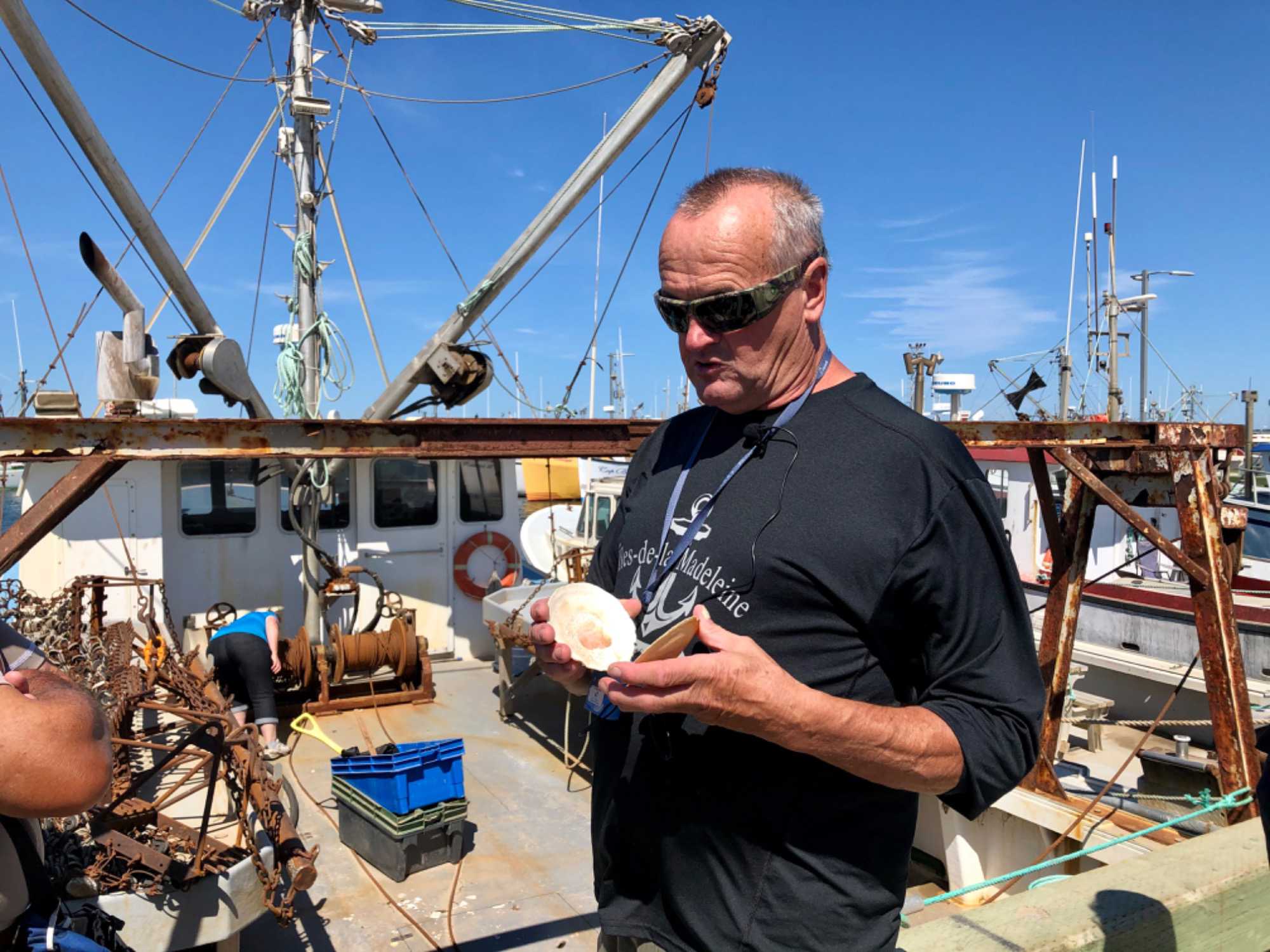 Une première découverte locale délicieuse et vraiment proche d’une bonne cuisine authentique et familiale. Après ce bon repas nous repartons avec Damien pour se diriger vers le port de Grande Entrée, le plus grand port de mer de l’est du Canada pour la pêche aux homards. Nous rencontrons Lauréat, ce pêcheur passionné qui ne demande qu’à nous partager ses connaissances sur les pêcheurs et leur vie. Nous découvrons leurs bateaux pour différents types de pêche. La saison du homard se termine normalement vers la mi-juillet et en ce moment c’est la pêche au flétan et au maquereau. Ce passionnant madelinot, nous embarque dans ses histoires et nous avons eu la chance d’aller visiter son bateau amarré au quai. Dans tous ces récits nous retenons le coût d’un permis pour la pêche aux homards où le capitaine de son bateau de pêche doit acheter ce permis à souvent plus de 500 000$... Oui c’est un peu comme pour nos agriculteurs et leur quota de lait. Il nous parle aussi de cette année avec le COVID ou pour la première fois de ses 145 ans d'histoire, la mise à l'eau des cages, qui marque le début de la pêche au homard aux Îles-de-la-Madeleine, s'est déroulée d'une façon inusitée. À 5h du matin samedi, en raison des risques de propagation de la COVID-19, les quais où se rassemblaient traditionnellement des milliers de personnes pour assister au grand départ des 325 bateaux, étaient déserts. Pas de festivités, pas de feux d'artifice. L'ombre au tableau de cette saison est davantage l'inconnu auquel devaient faire face les pêcheurs de homard. Ils étaient partis en mer sans connaître le prix qu'ils auraient pour leur butin et sans savoir la façon dont réagiraient les marchés. Malgré les incertitudes, les pêcheurs étaient heureux d’après Lauréat. Ça leur faisait du bien de passer à autre chose. La pêche, c'est la vie, la vitalité, le retour du printemps. La COVID était loin. Ça faisait du bien. On l'entendait partout! Prendre le large, se retrouver au milieu de l'océan, n'est-ce pas là la plus belle image d'un déconfinement total?