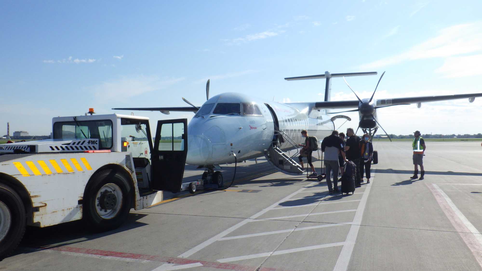 L’embarquement se fait sans problème et avec respect des mesures sanitaires. Nous prenons place à bord d’un Dash-8 400 de 80 personnes d’Air Canada. Comme c’est deux rangées de deux sièges par rangée je peux voir facilement que l’avion est empli de voyageurs heureux d’aller aux Îles-de-la-Madeleine.
