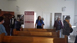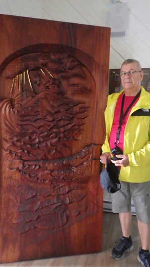 Après notre habituel petit-déjeuner à l'auberge, nous partons pour notre visite d'Old Harry où se trouve la magnifique plage de la Grande-Échouerie. De l’autre côté, il y a la Seacow Path. Notre gentille guide et chauffeure Blanche nous a bien expliqué l’histoire des morses. Tout près se trouvait l’église St-Peter’s de Old Harry. L'église Saint-Peter's-By-the-Sea, citée monument historique, est un lieu de culte de tradition anglicane érigée en 1916 et 1917. D'influence néogothique, le temple se compose d'une nef de plan rectangulaire terminée par un chœur en saillie à chevet plat et est coiffé d'un toit à deux versants droits. Il se distingue par l'aménagement d'une tour clocher demi-hors-œuvre avec allonges dans l'un des murs pignons et d'un porche sur l'un des longs pans. L'église et un cimetière adjacent sont situés dans le hameau d'Old Harry, aujourd'hui compris dans la municipalité de Grosse-Île. C'est impressionnant, lorsque nous passons la porte offerte en l’honneur d’un jeune homme de 20 ans qui aurait sauvé deux jeunes filles de la noyade. Magnifiques portes de bois sculptées qui nous laissent entrer dans une petite église ornée de photos de Madelinots ayant perdu la vie en mer. Impressionnant de voir tant de photos de ce peuple de marins. On peut aussi y voir plusieurs navires ayant fait naufrage. L’on réalise que leur vie, c’est la mer, mais que cette dernière peut aussi être bien cruelle. Ce fut tellement touchant de voir les photos qu’on arrivait presqu'à vivre un peu de leur douleur. Ouf!