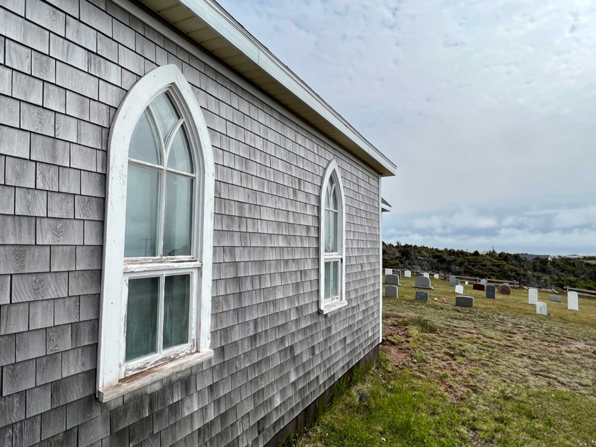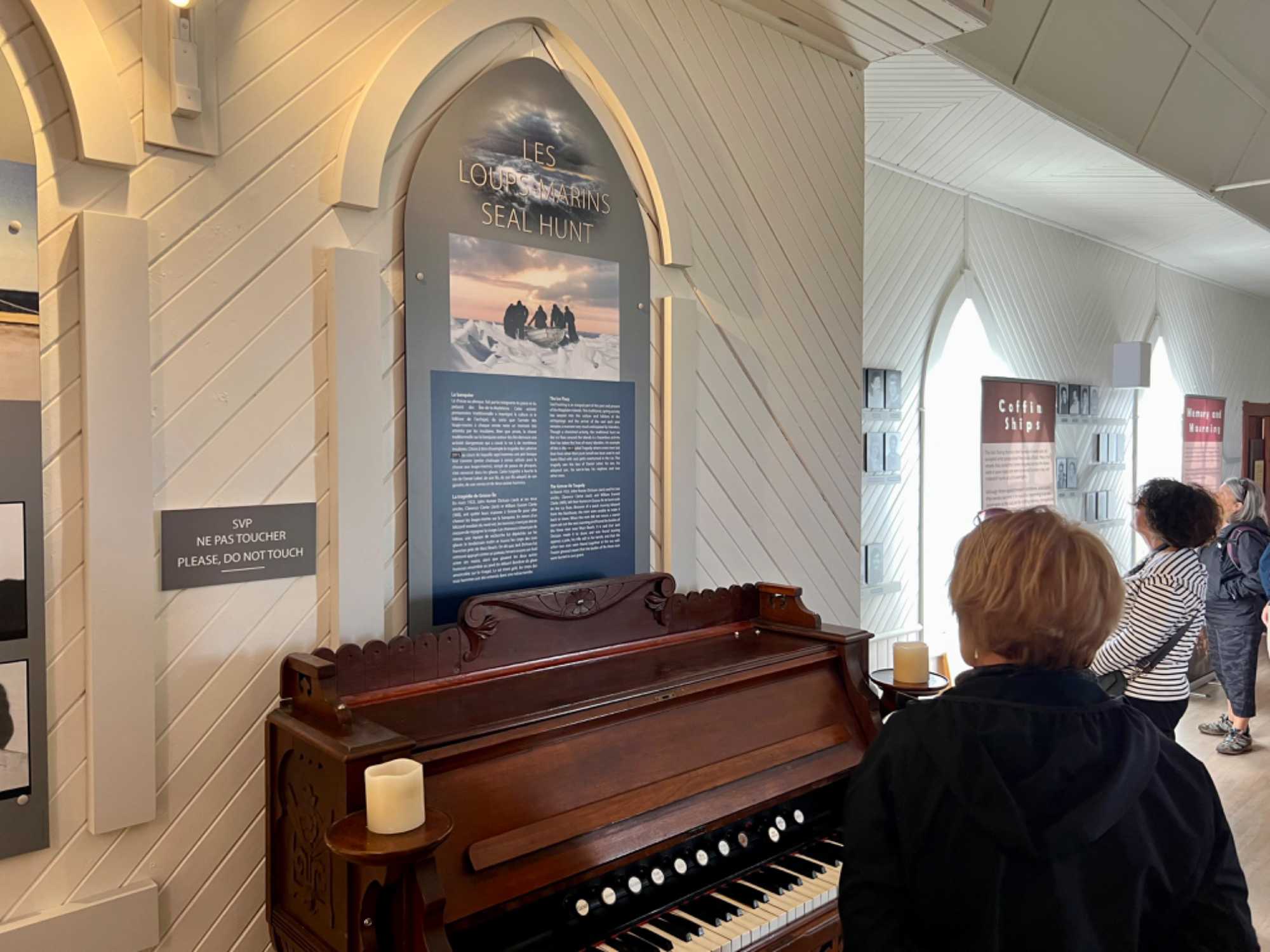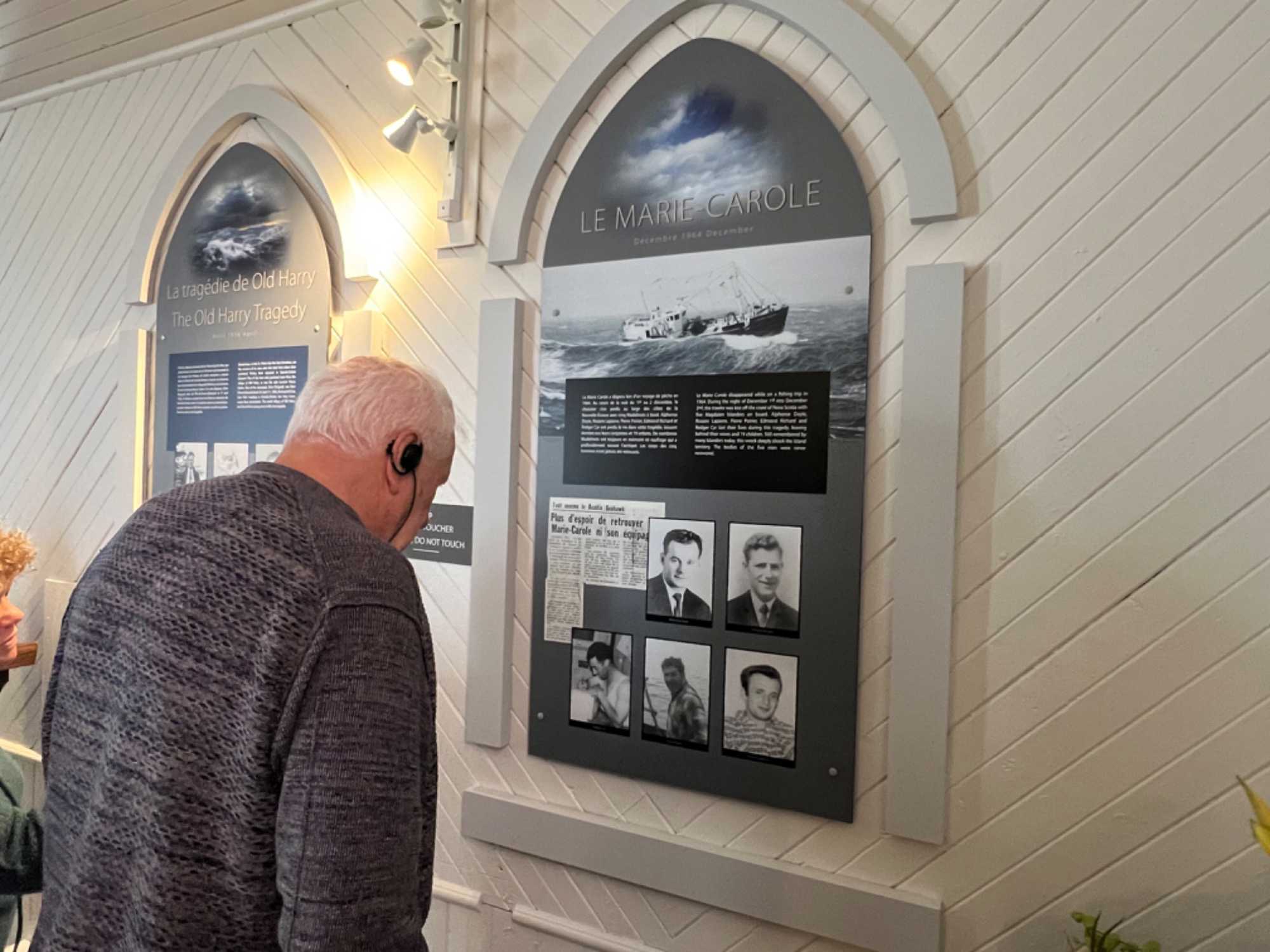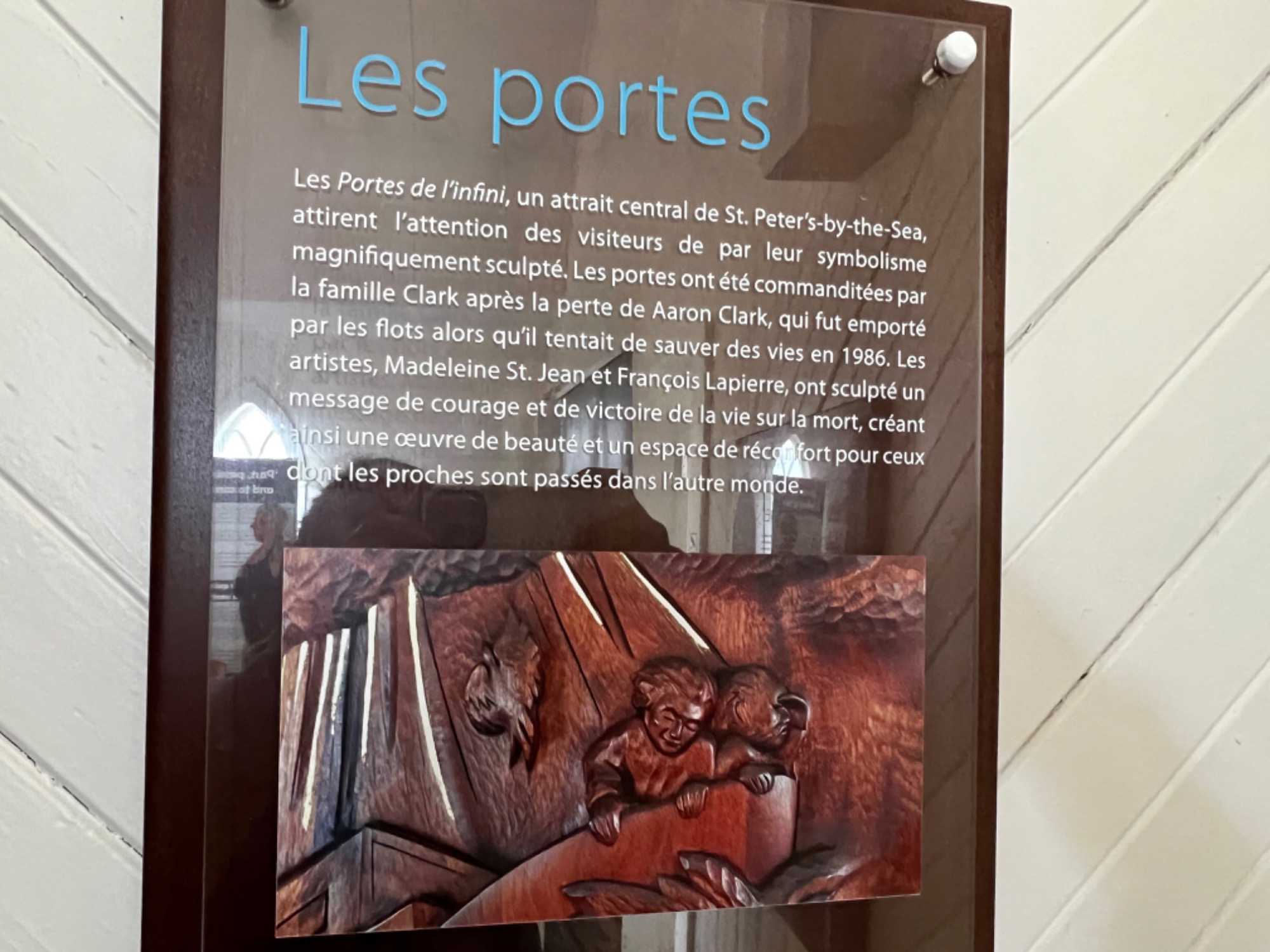 Par la suite nous reprendrons la route vers cette fois une autre charmante petite église aux allures saxonne, l'Église St. Peter’s By the Sea, qui est une ancienne église anglicane convertie en musée et dédié aux naufrages et naufragés de la mer. On voit à l'intérieur, les visages de ceux qui ont perdus la vie en mer, dont certains étaient vraiment très jeunes. Cité monument historique, ce lieu de culte est de tradition anglicane et fut érigé en 1916 et 1917. D'influence néogothique, le temple se compose d'une nef de plan rectangulaire terminée par un choeur en saillie à chevet plat et est coiffé d'un toit à deux versants droits. Il se distingue par l'aménagement d'une tour clocher demi-hors-œuvre avec allonges dans l'un des murs pignons et d'un porche sur l'un des longs pans. L'église et un cimetière adjacent sont situés dans le hameau d'Old-Harry aujourd'hui compris dans la municipalité de Grosse-Île. Mais ce qui est impressionnant lorsque nous passons la porte, c'est de voir la sculpture sur celle-ci. Elle a été offerte en l’honneur d’un jeune homme de 20 ans qui aurait sauvé de la noyade deux jeunes filles. Impressionnant de voir tant de photos de ce peuple de marins. En se promenant, on peut aussi y voir plusieurs navires ayant fait naufrage et y lire leur histoire. On réalise sur le moment, que leur vie c’est la mer et que cette dernière peut aussi être bien cruelle parfois. Voilà la vie de marins-pêcheurs.