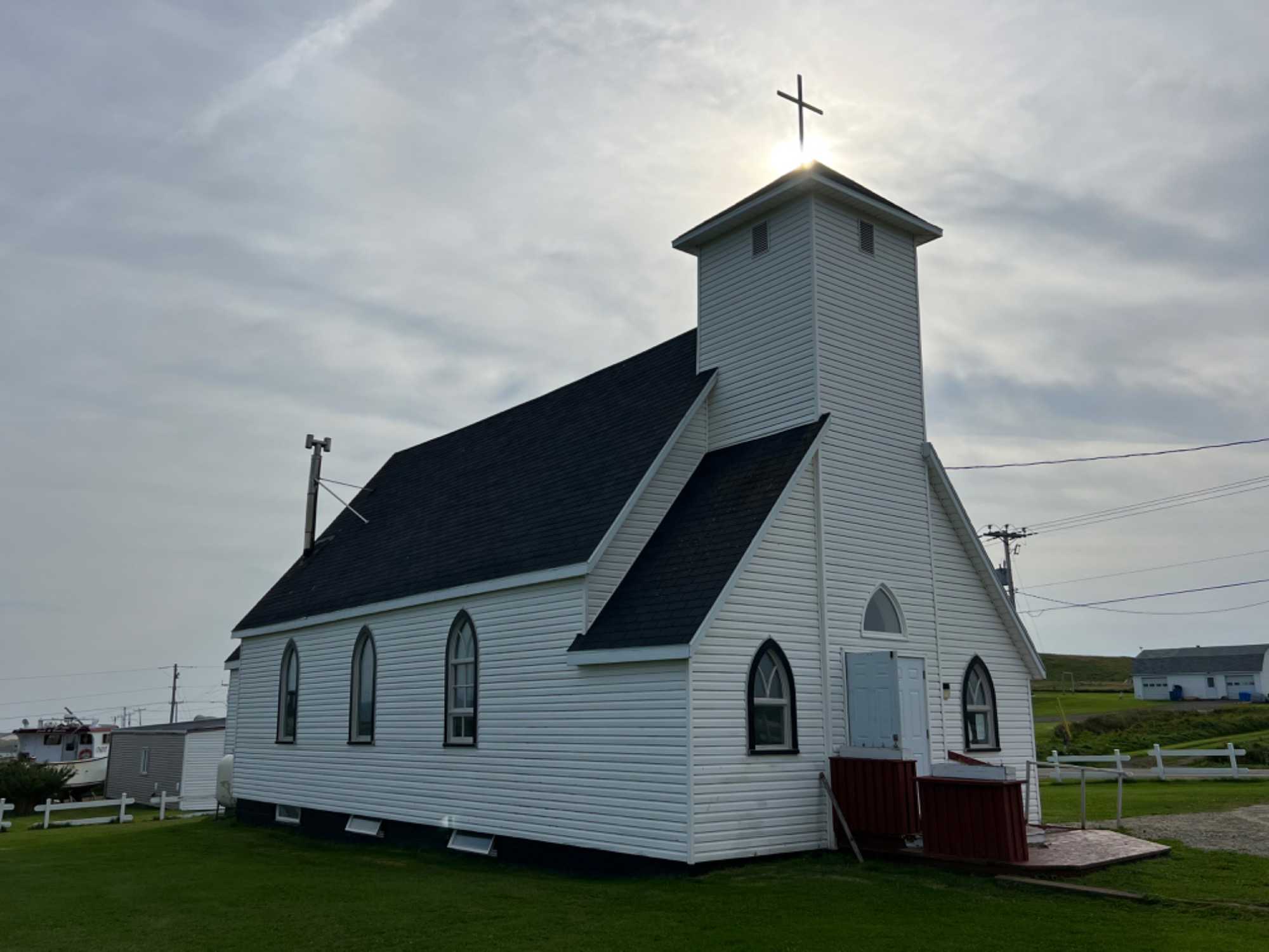 Une fois s'être bien nettoyés le visage, nous remontons vers l'auberge pour redescendre de l'autre côté, afin d'aller tout en bas, visiter l'église Sacré-coeur de Grande-Entrée. Plusieurs informations y seront données encore une fois par Josée. Photos, questions de toutes sortes et c'est avec une belle marche d'une heure que plusieurs voyageurs marcheront le sentier le long des caps. Une belle rando avec la lumière du soleil qui descend tout doucement. C'est juste Wow!