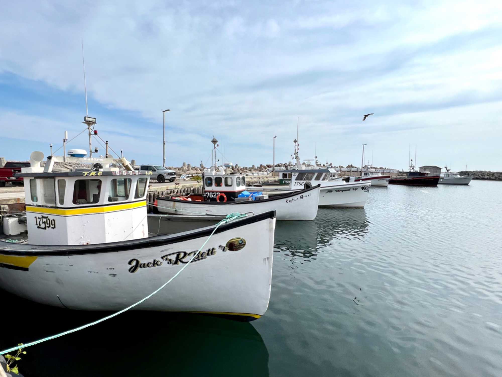 Comme nous sommes tout près du port de Grosse-Ile, nous ferons un arrêt à ce port anglophone où l'on retrouve une quantité considérable de bateaux de homards mais moins grande que le port de Grande-Entrée qui en est la capitale aux îles.