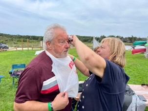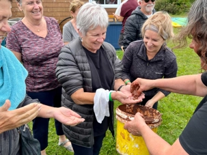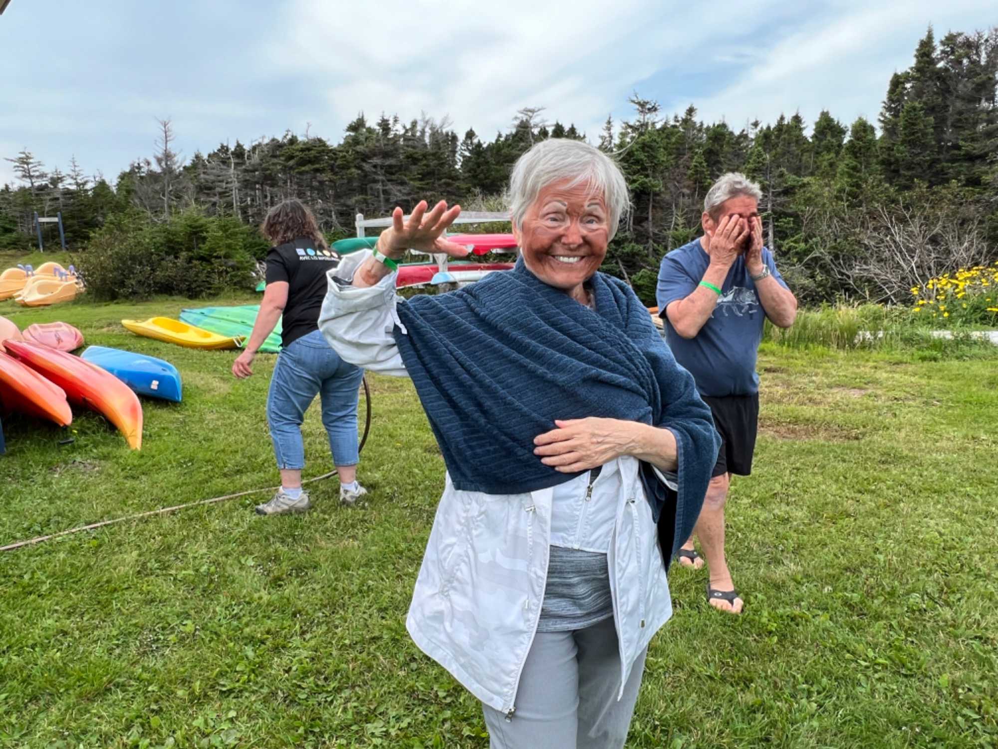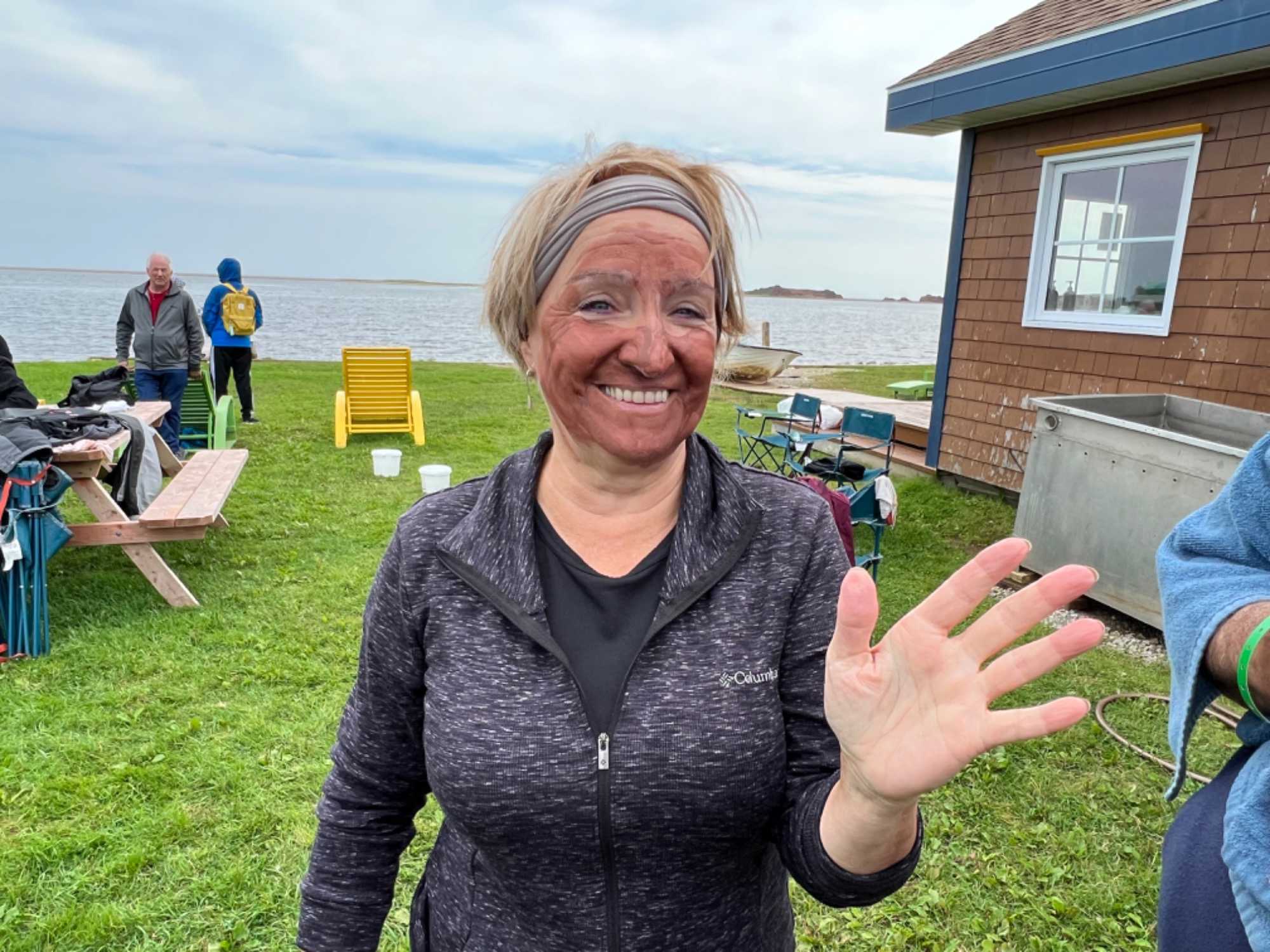 Treize personnes décideront de tenter l'expérience tandis que d'autres seront venus nous regarder et rire avec nous. Que de plaisir à chaque fois nous avons! Fous rire sont au RV. Ce masque riche en minéraux, comme le fer, est bénéfique pour la peau. On nous promets 10 ans de moins y paraît mais l'important est le plaisir vécu dans cette activité tous ensemble. La mer tout à côté est calme et le vent très faible. What a belle expérience!