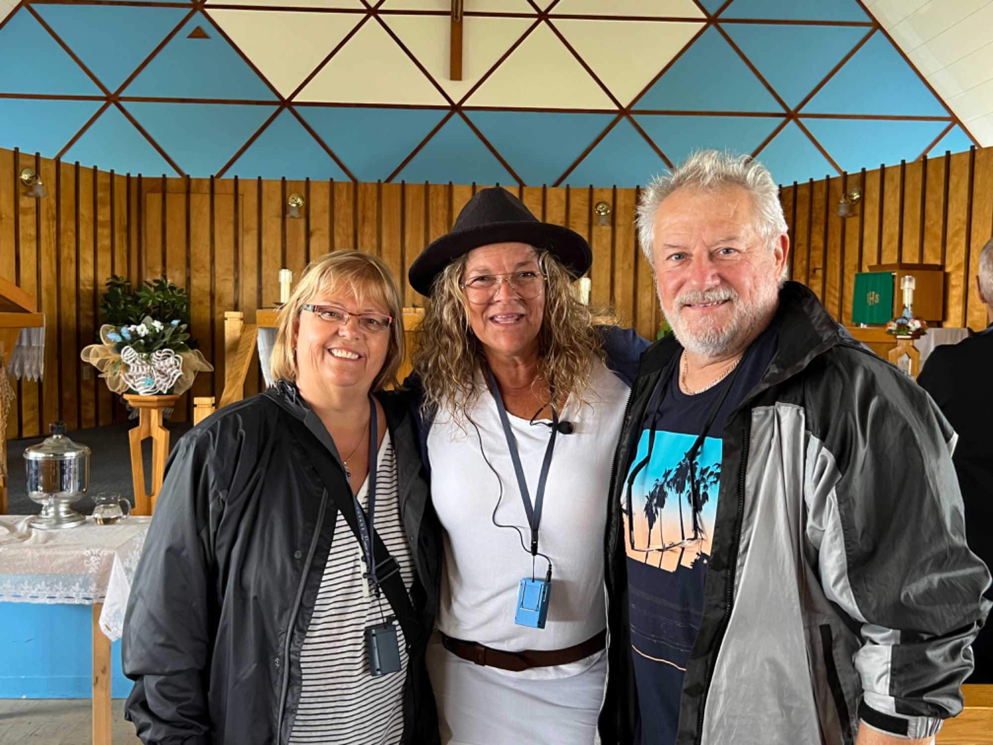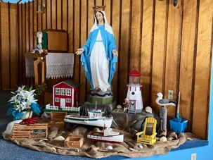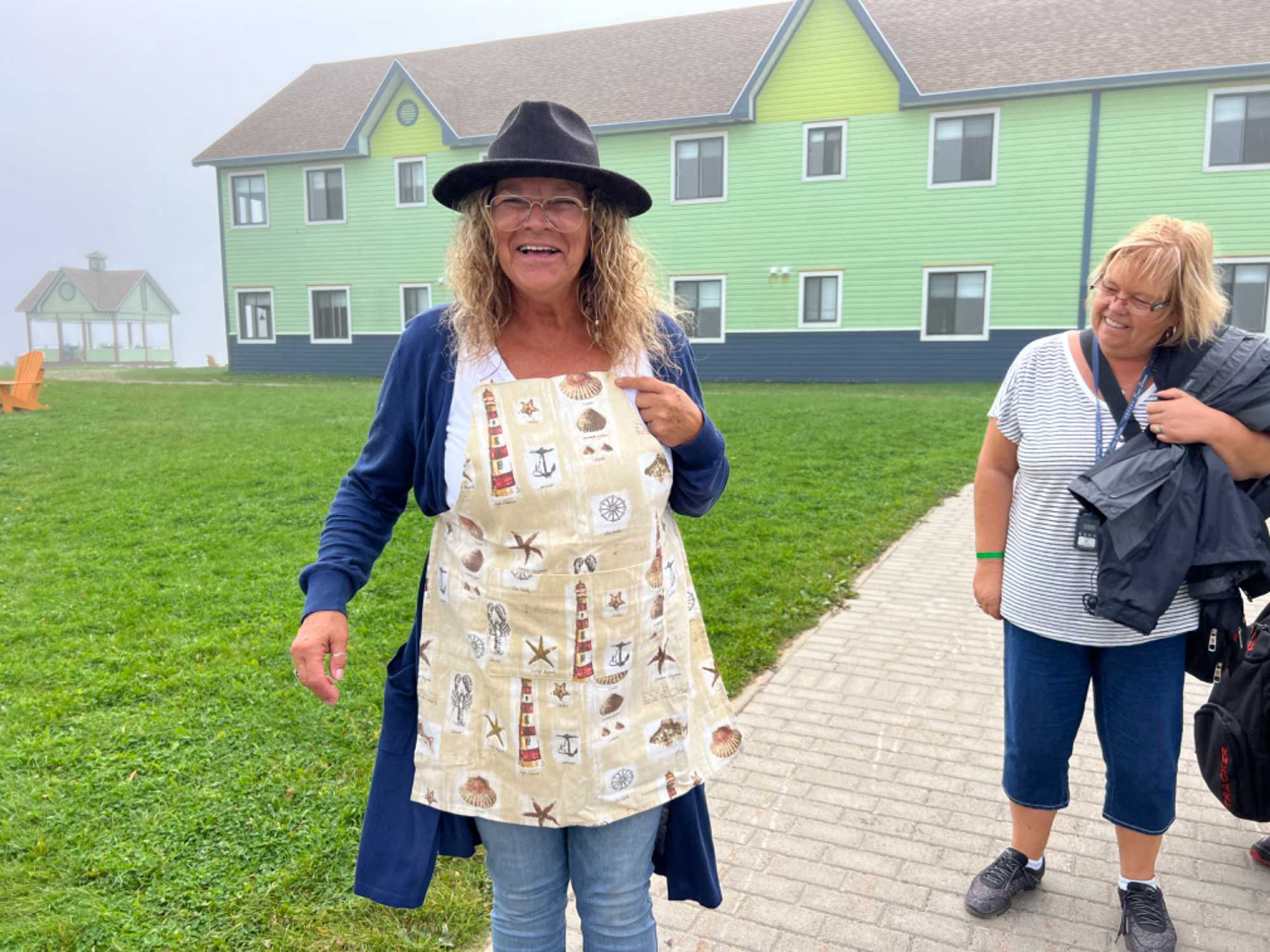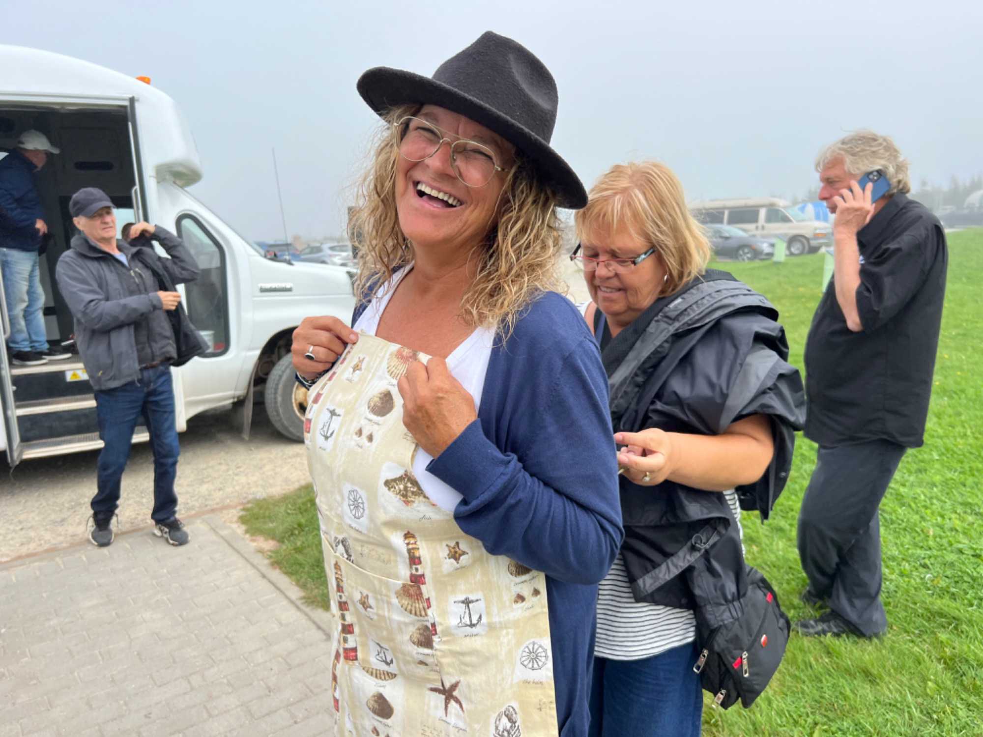 Hier Air Canada nous avait donné un autre vol pour aujourd'hui en pm alors pour occuper l'avant-midi, Robert, Josée et moi avons préparé une surprise pour les voyageurs. Comme ils avaient beaucoup aimé le spectacle d'Elaine Richard, conteuse, on a pensé l'inviter à nouveau avec nous mais cette fois pour qu'elle nous parle du village de Pointe-aux-loups, le plus petit village des îles avec 75 personnes seulement. Nous sommes donc tous partis avec Karine et son autobus scolaire ainsi qu'Elaine, vers Pointe-aux-loups. Tout le long, elle nous a raconté pleins de belles histoires des îles et une fois arrivé à l'église de ce village, nous sommes entrés nous asseoir et l'avons écouter nous raconter les histoires de ce village, la solidarité qu'il y a, des jeunes partis qui y reviennent et plusieurs autres. Elaine sait raconter avec émotions. On pourrait l'écouter des heures et des heures. Elle a même eu droit à une ovation à la fin. Tellement touchante cette Elaine! Merci à toi encore une fois.