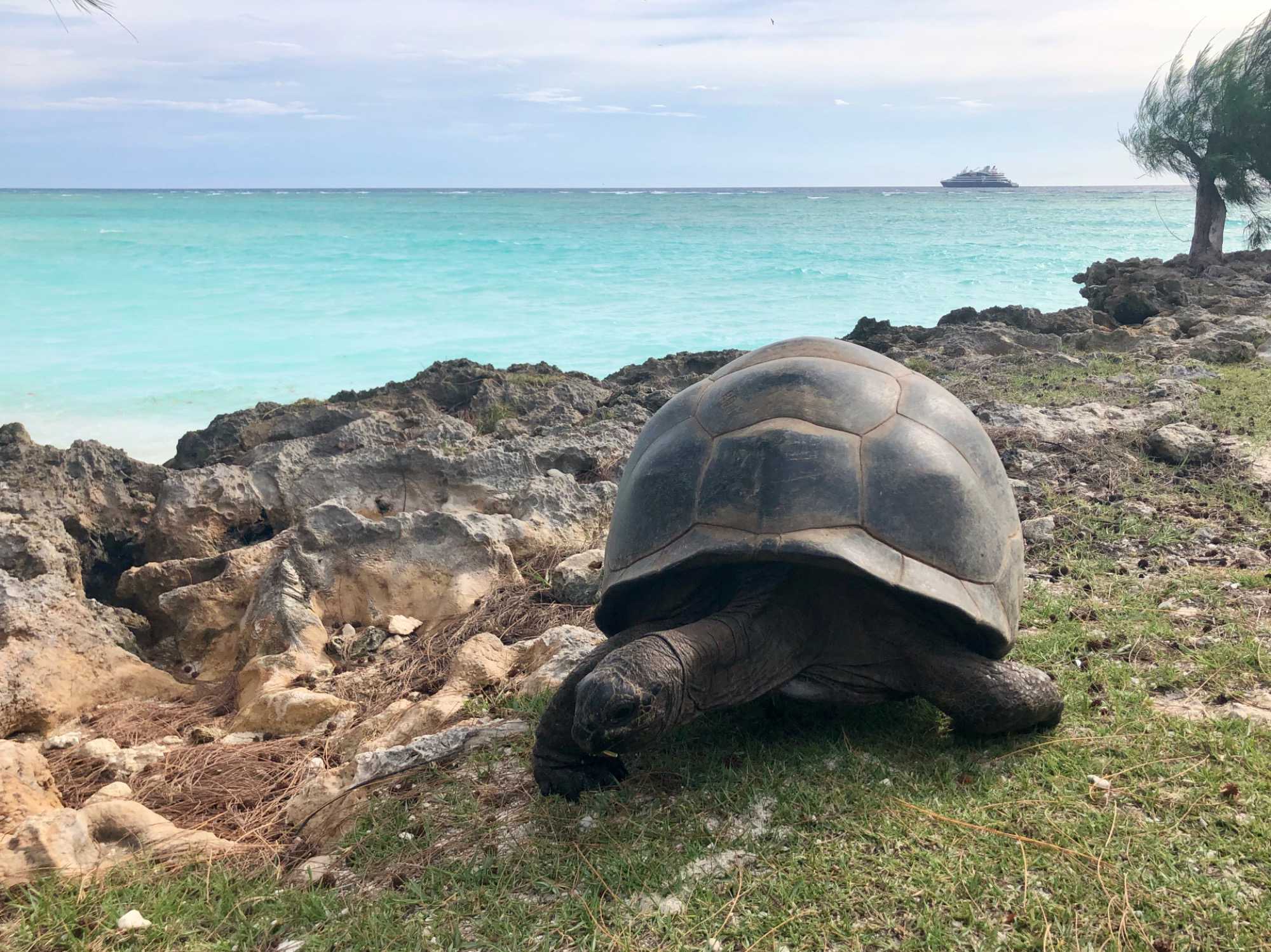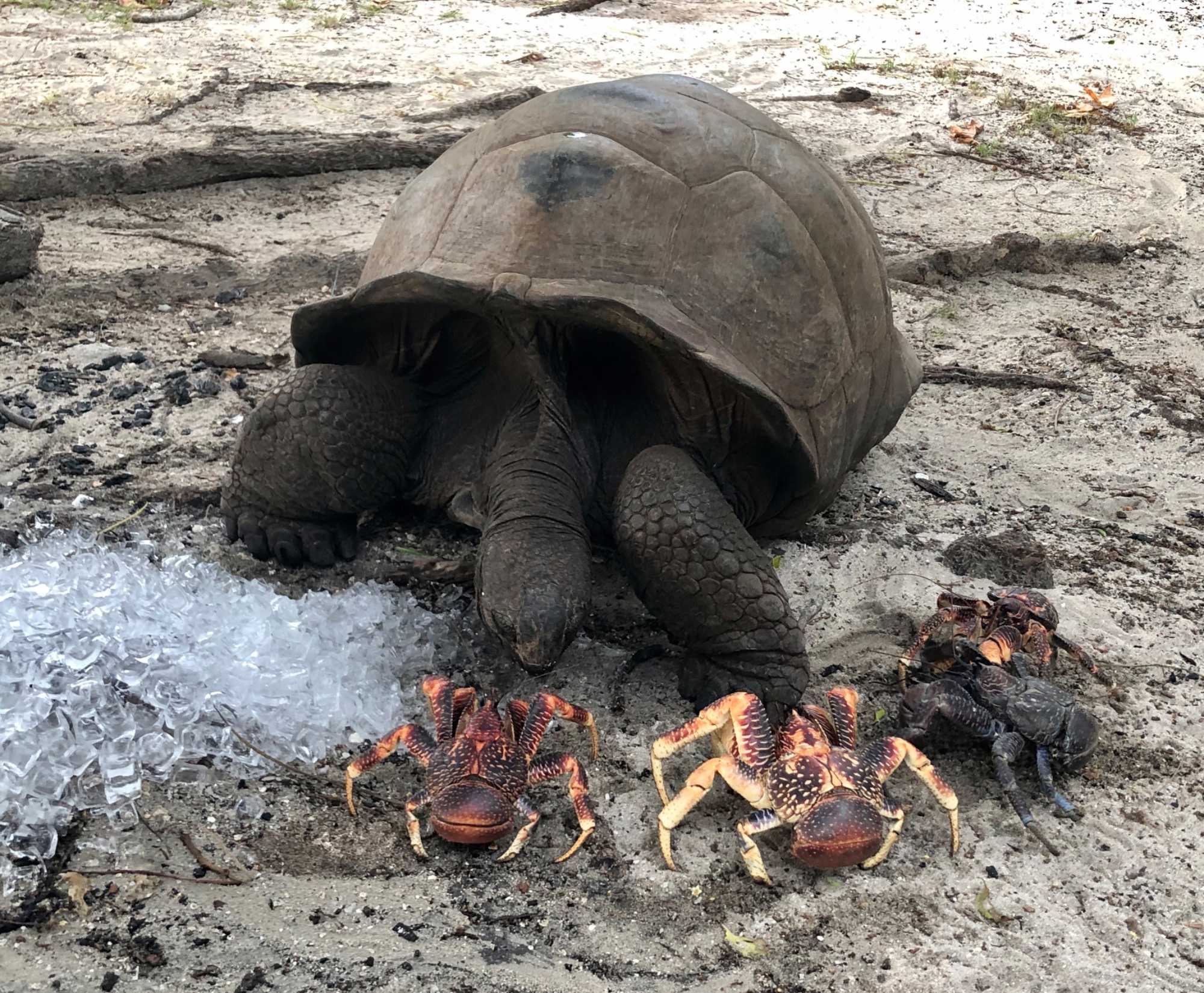 L'atoll est un refuge pour plus de 400 espèces et sous-espèces endémiques (vertébrés, invertébrés et plantes). Parmi celles-là, la plus grande population au monde de tortues géantes Geochelone gigantea (plus de 100 000 individus). Les tortues sont les derniers survivants d'une forme de vie autrefois répandue sur d'autres îles de l'Océan Indien. Aldabra en est aujourd'hui leur seul habitat restant. En raison des difficultés d'accès et de l'isolement, Aldabra a été préservé de l'influence humaine et est devenu un refuge pour quelque 152 000 tortues terrestres géantes, soit la plus grande population mondiale de ce reptile. Oui c’est beaucoup vous avez raison car c’est plus que toute la population des Seychelles. Parmi les tortues géantes des Seychelles (les mâles peuvent atteindre 1,20m de long et peser jusqu'à 300 kg pour une durée de vie allant jusqu’à 250 ans) elles sont nombreuses à y trouver refuge.